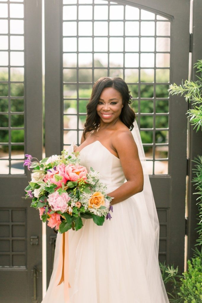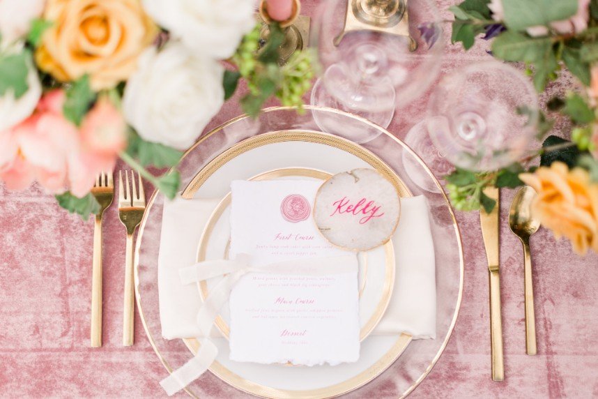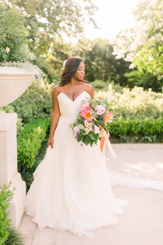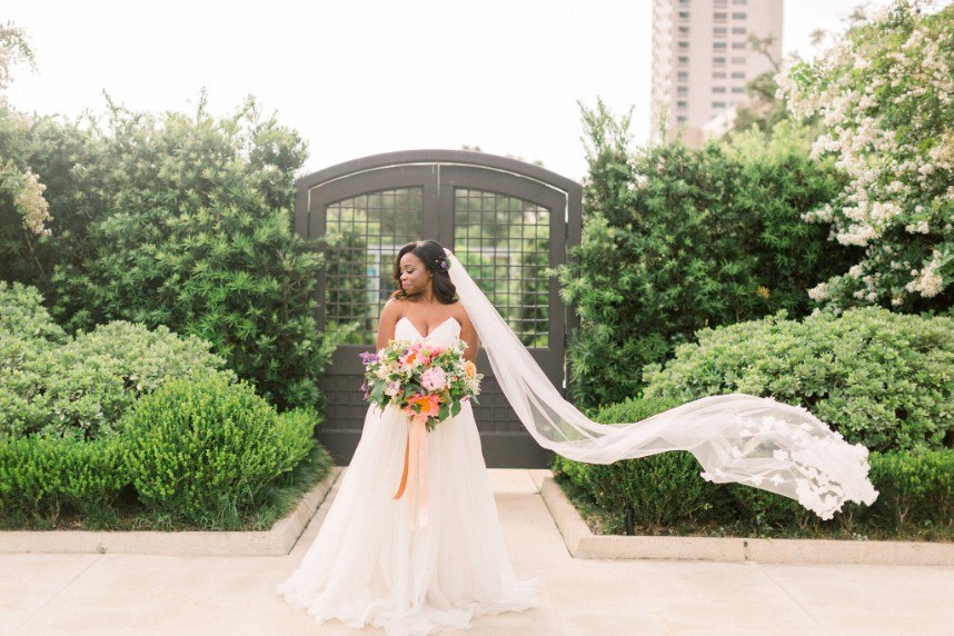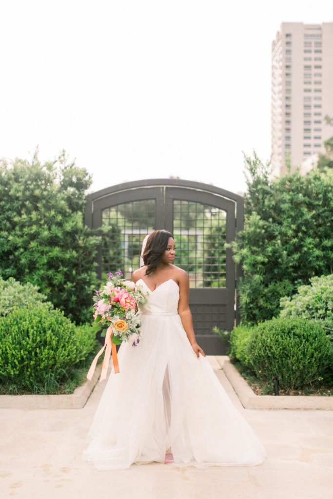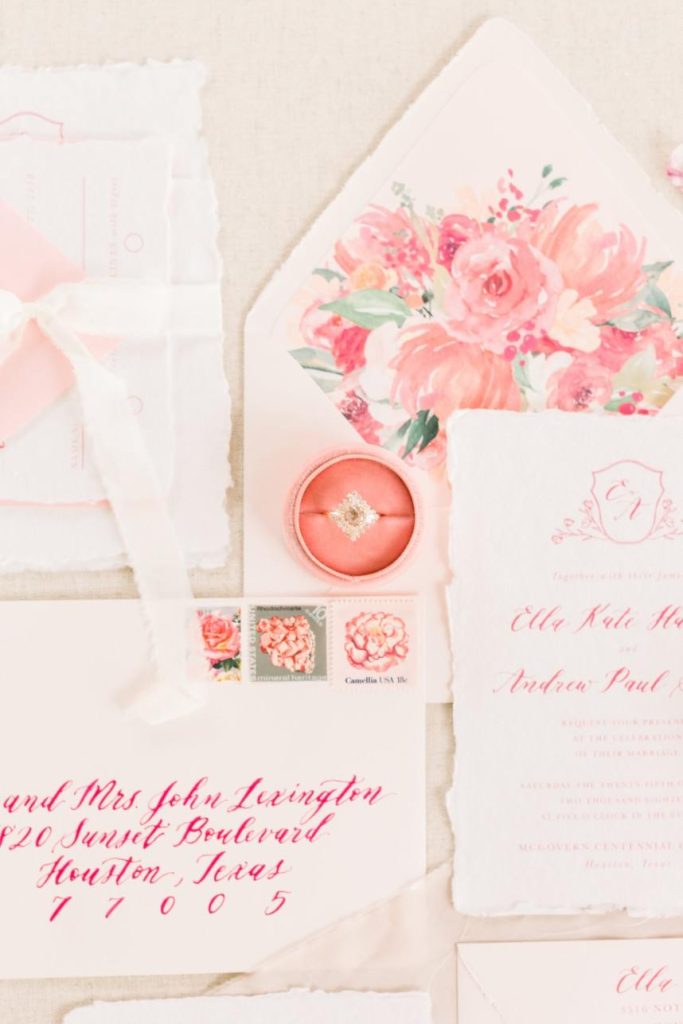 We’re tickled pink to share this darling garden-inspired, feminine styled shoot with you today! From Houston wedding photographer FulleyLove Photo and a dream team of vendors, this wedding inspiration draws on the natural beauty of the urban garden setting while featuring contemporary romantic touches. Perfect for a bride who’s not afraid to embrace her feminine side, this gorgeous scene includes all shades of pink, from the mauve velvet linens to the more whimsical, bright and colorful bouquets by Lanson B. Jones Floral with roses and peonies galore! Shelby Elizabeth Cakes outdid herself on the three-tiered marble cake in her signature gravity-defying style. It’s whimsical and jaw-dropping and everything a modern bride would love! A stunning invitation suite by Dreams and Nostalgia featuring unique hot pink calligraphy and a floral envelope liner helps tie everything together and truly evoke the theme of the day: exactly what an invitation suite is meant to do! One thing’s for sure, this wedding inspo is so pretty in pink, and we adore everything about it! Cheers!