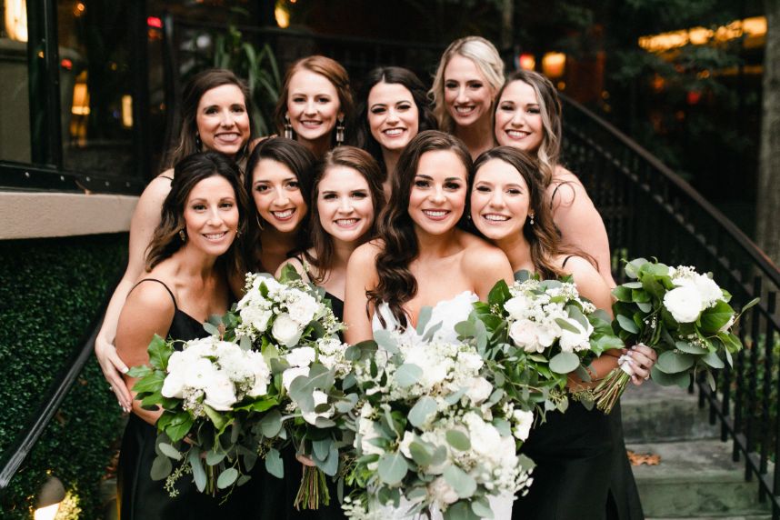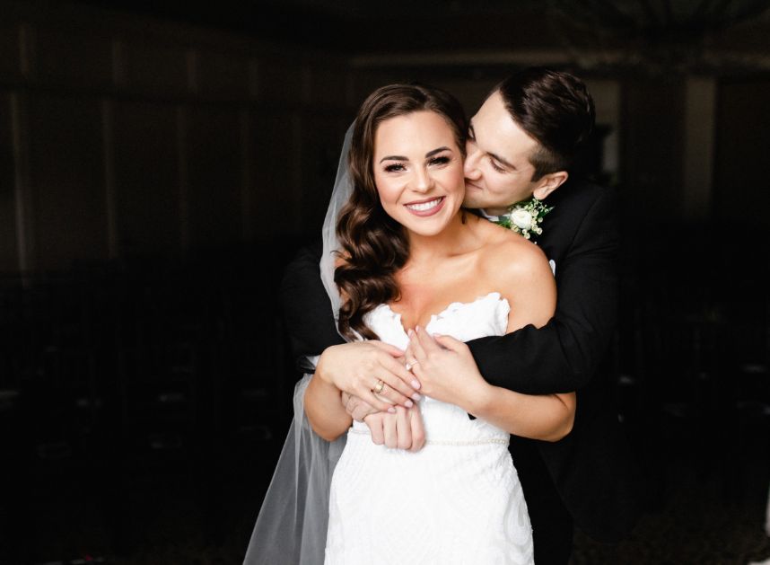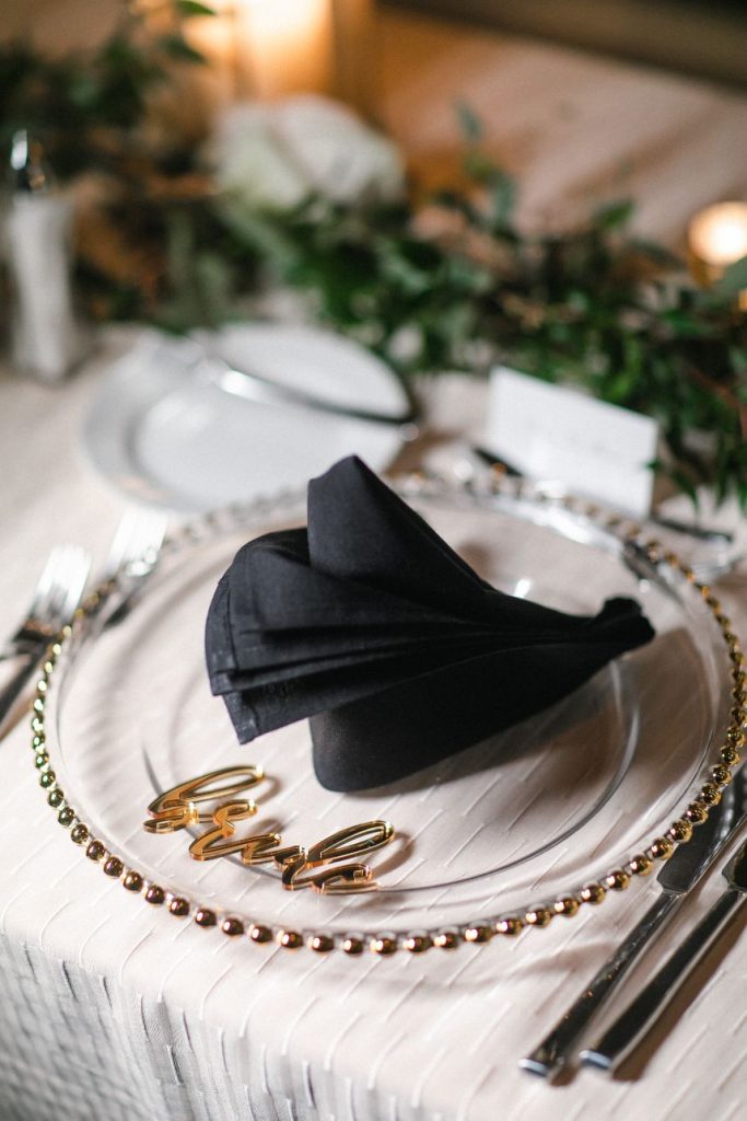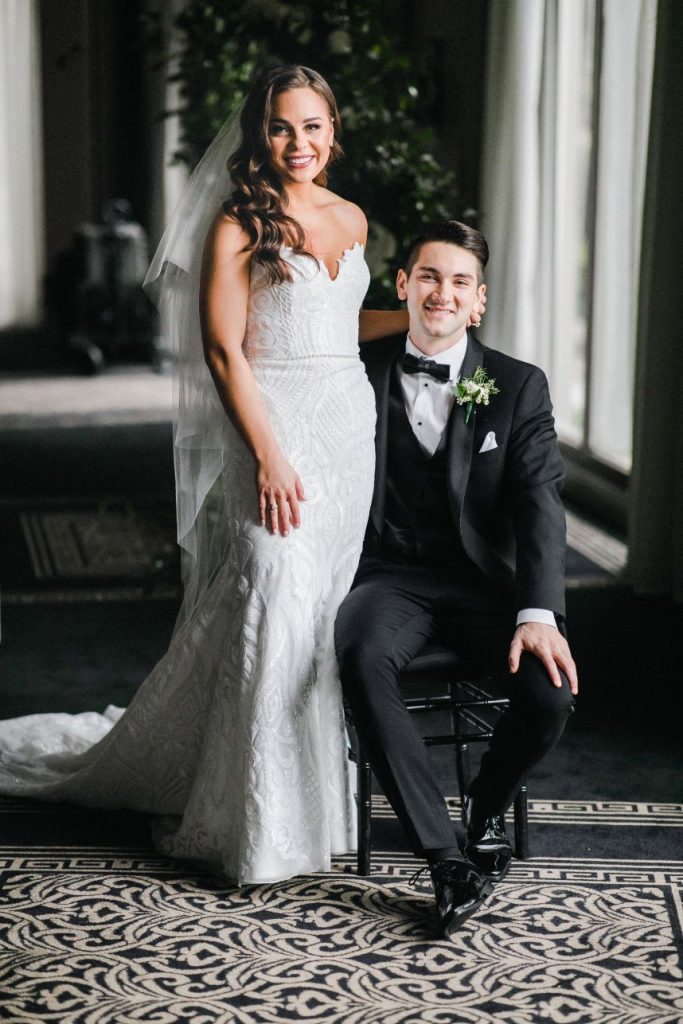 Paige and Cameron wanted a celebration with a modern timeless feel, and we think their classic black and white wedding day planned by Chancey Charm Weddings embodies that feel in every aspect! Featuring a stately chic design, lustrous gold details and abundant greenery, there is truly not a single detail about this timeless affair that we don’t absolutely love. Paige looked unbelievably gorgeous in her mermaid style bridal gown from Brickhouse Bridal that was a perfect choice to wear for her November wedding, paired with a flowing veil to beautifully top off her wedding day attire. Their moody ballroom reception scene couldn’t be more dreamy, as the candlelit ambiance made for an oh-so romantic place to celebrate the start of their new life together and to enjoy their delicious-looking four-tiered textured wedding cake from Cakes by Gina. This modern timeless celebration was without-a-doubt the best, most perfect day of Paige and Cameron’s lives, as they definitely would re-live it again in a heartbeat. Lucky for them, Reverent Wedding Films documented their whole day so flawlessly, watching their day in film is almost as close to re-living their big day as you could get! Scroll to see how this modern timeless day will never go out of style and to read about the bride’s favorite memory. Cheers to the LaMarcas!