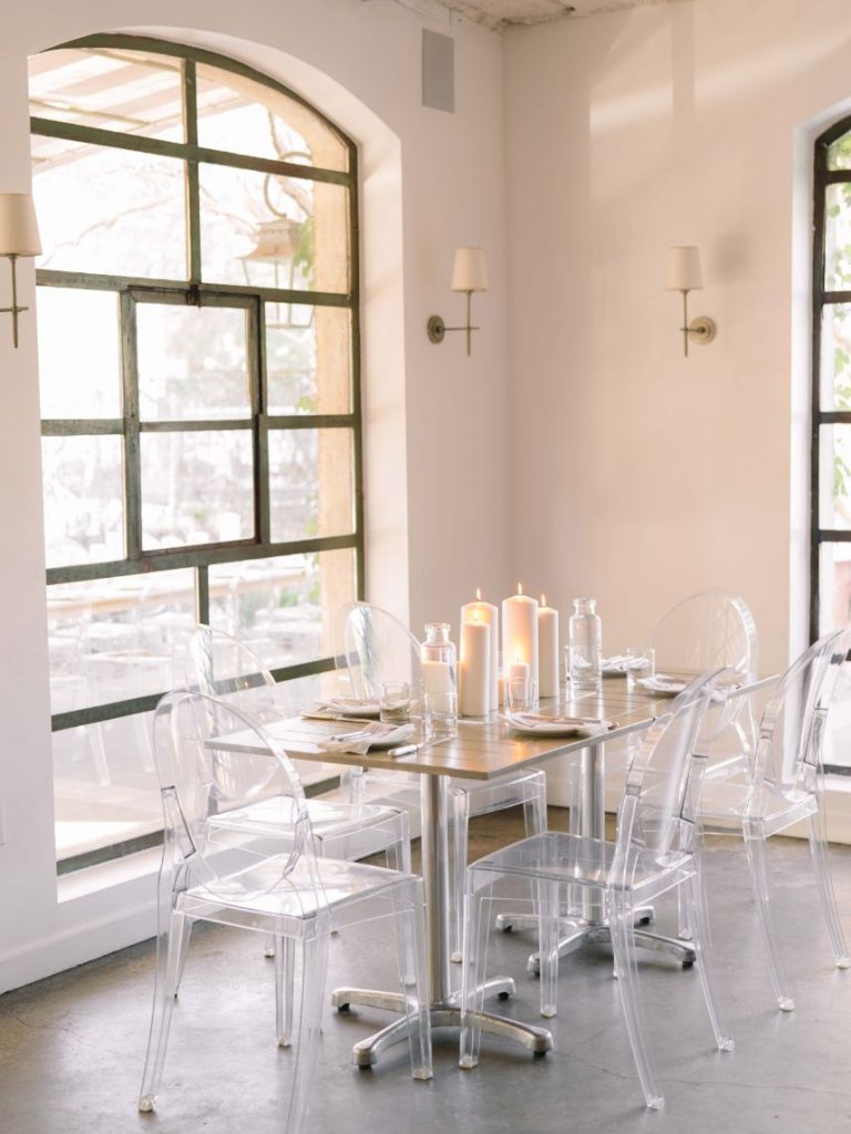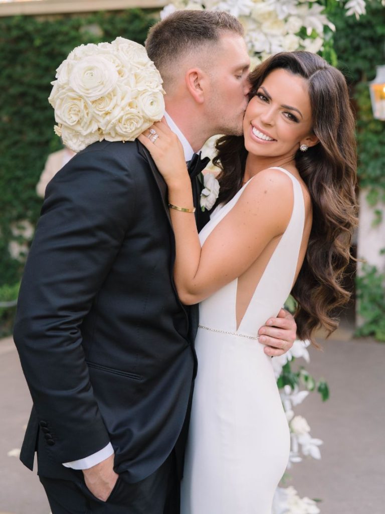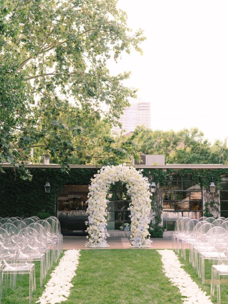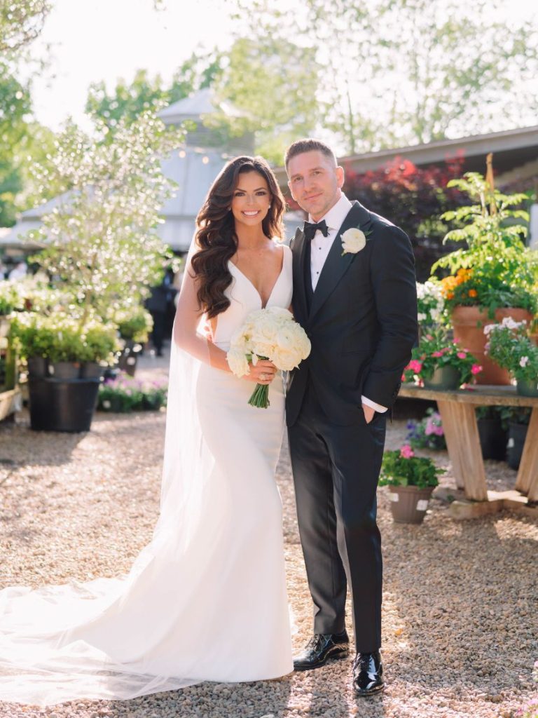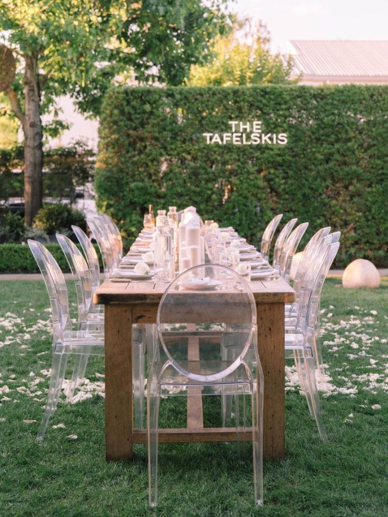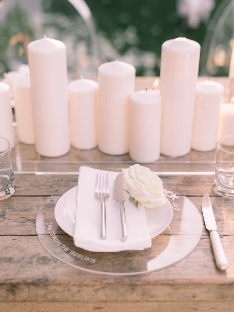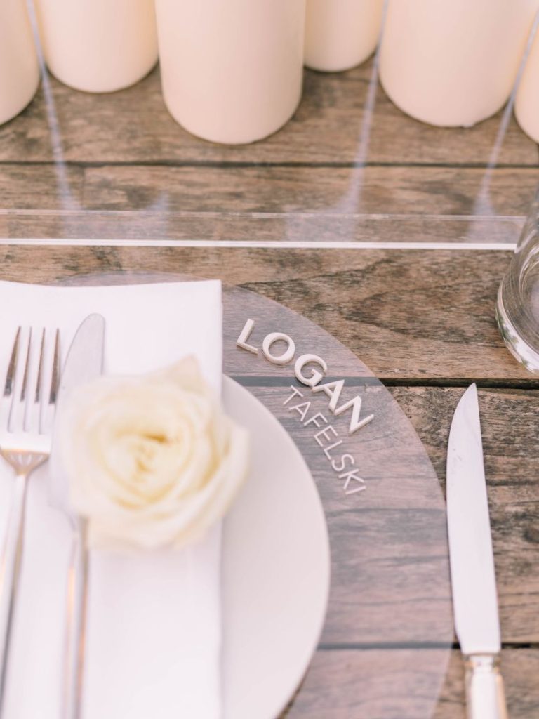 Incorporating personalized details that screamed “them” was the #1 way Logan and Zach created their dream wedding experience that they were both proud of – including their guests wearing white, having an intimate celebration and incorporating a dreamy day to night transition on the grounds of their favorite date night location. Timeless bunches of white roses gracefully adorn each tablescape, complimented by clear glass decor and subtle pops of sleek silver details. Abundant lush greenery and natural wood accents bring in a fresh touch and blend so well with the white aspects of this day, creating an undeniable romantic ambiance. Scroll to see all of the timeless elegance from Logan and Zach’s big day captured by Stephania Campos Photography. Cheers to The Tafelskis!