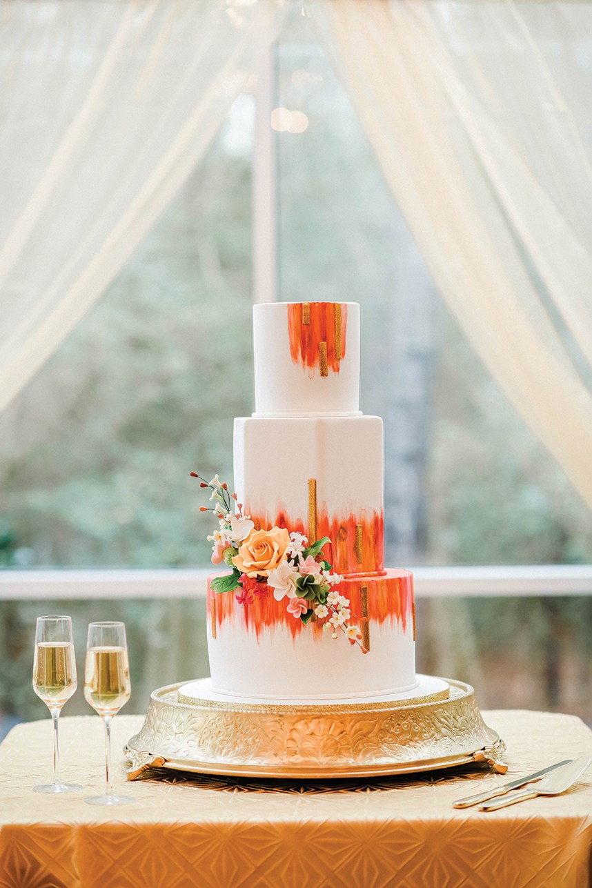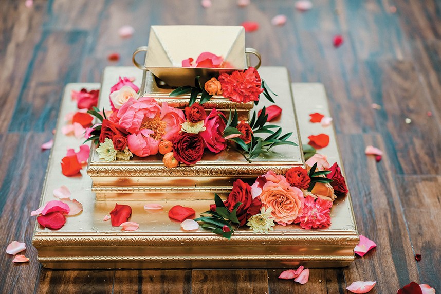 “The cake is covered in white fondant with hand-painted colorful lines, golden glitter covered fondant strips for a hint of glam, and our show-stopping sugar flowers. We chose a hexagon shape as the middle tier to enhance the uniqueness of a modern Indian wedding.” -Melanie, Cakes by Gina