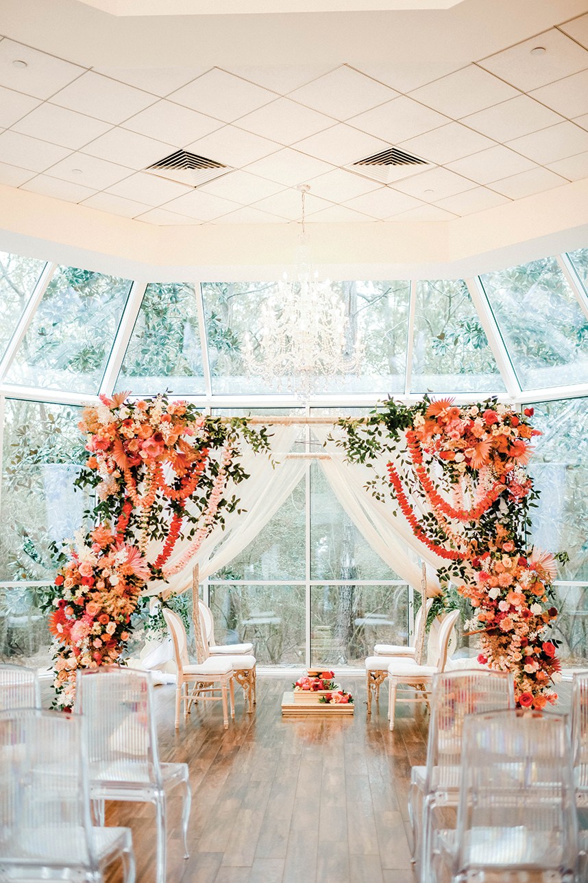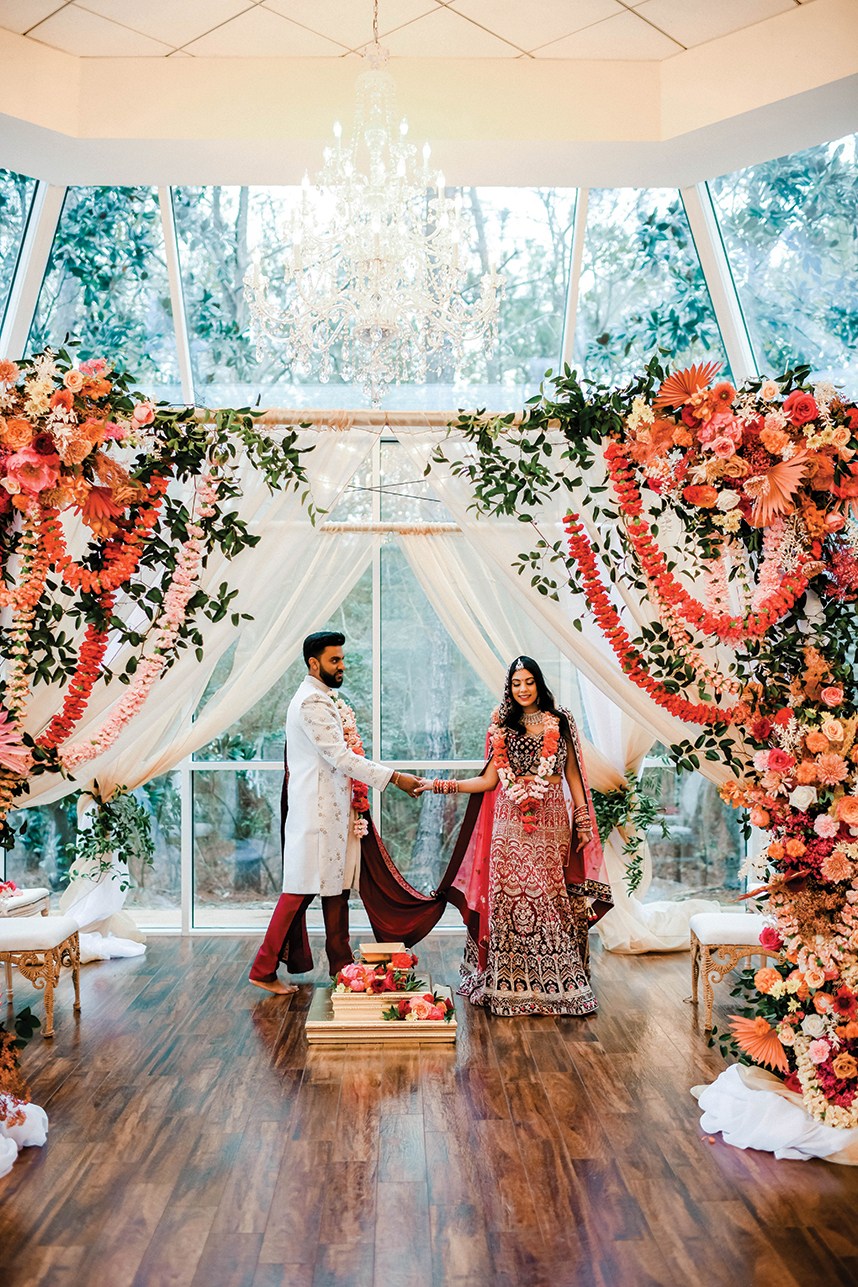 The wedding mandap, or wedding altar, is a temporary structure constructed for the purpose of the marriage ceremony, made up of four points or pillars in a variety of shapes and design elements. The couple is traditionally joined beneath the mandap by their parents and the ceremony officiant.