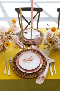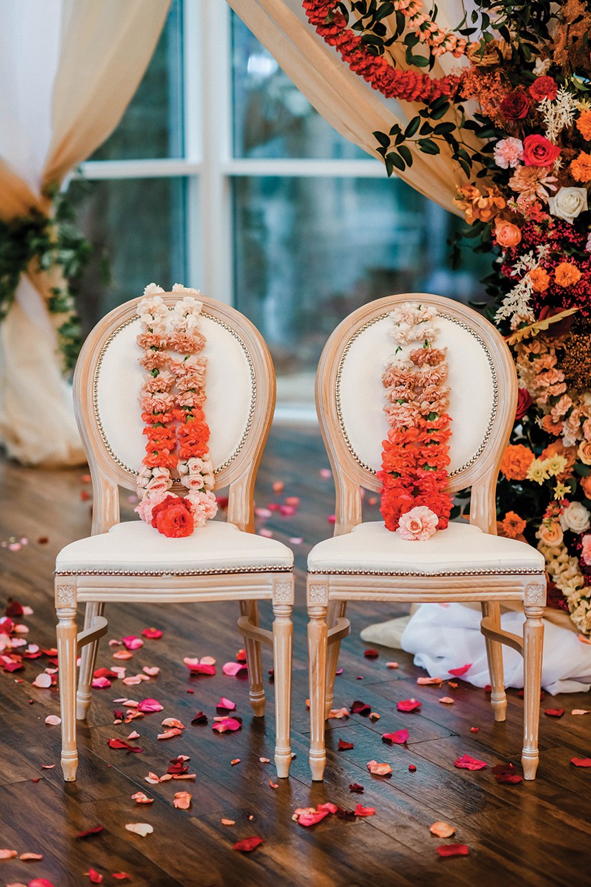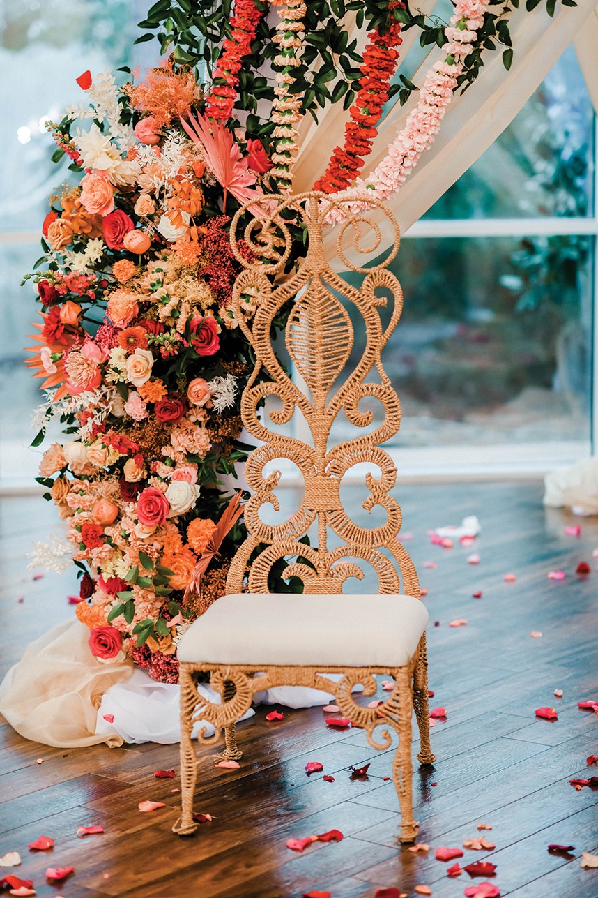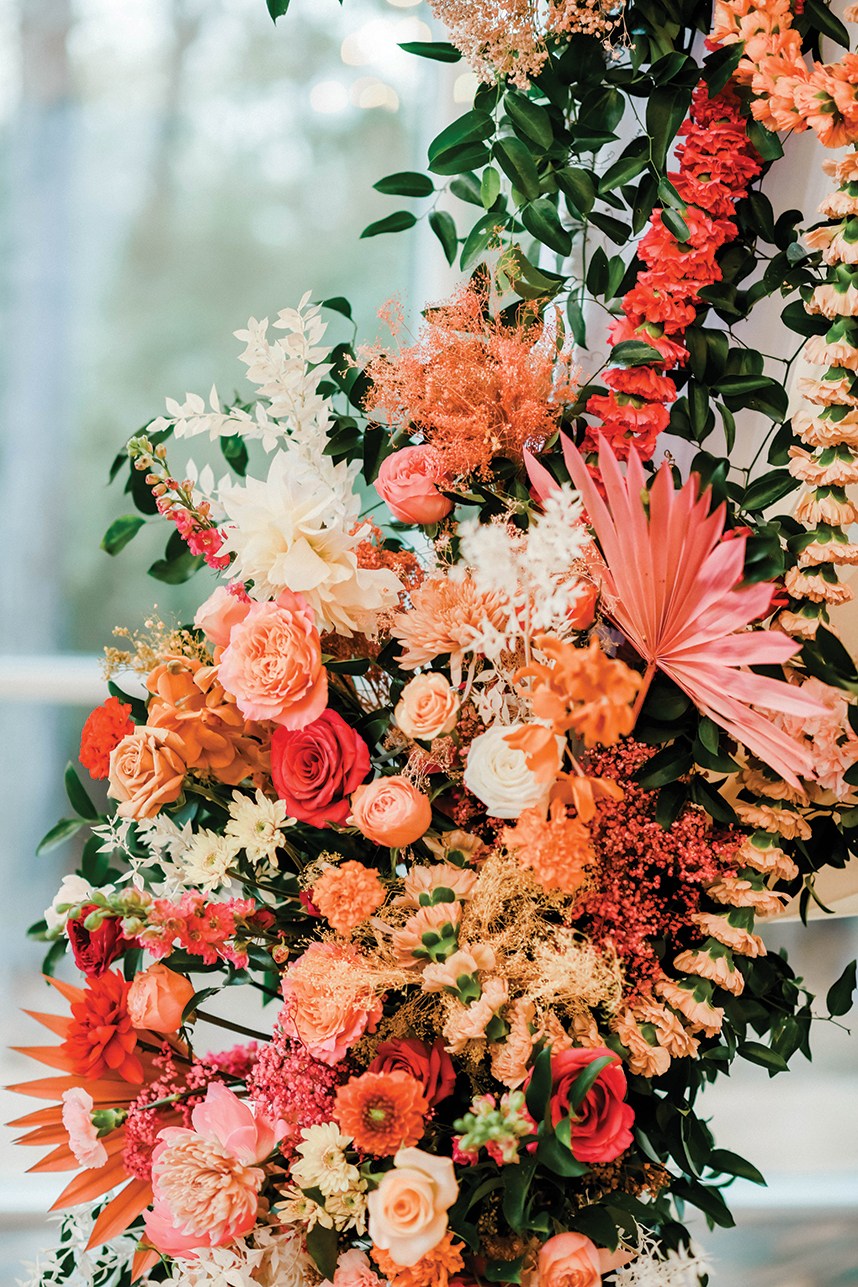 “What I loved about the design was all the fun, bright colors mixed with some more pastel muted tones. The mix of traditional with a more modern twist with the painted baby’s breath, fan palms and bleached ruscus added in for a more modern look but still very upscale. We added carnation garlands to give the feel of curtains by looping them throughout the design for a more modern twist. The carnation mangalsutra garlands are used traditionally in Indian ceremonies, but I wanted to add them to the altar as a fun twist.” –Bobbi, Unforgettable Floral