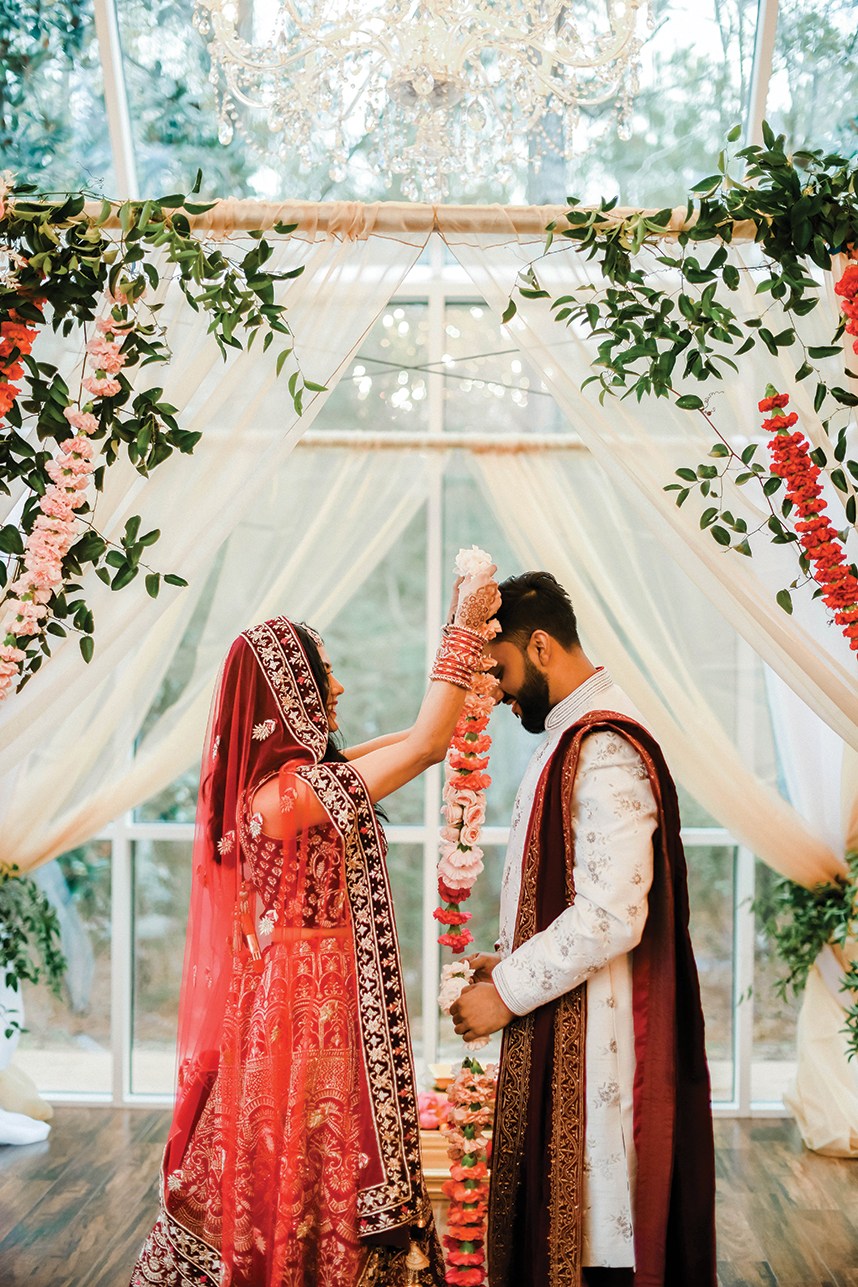 The bride and groom welcome each other by exchanging floral garlands. This exchange signifies the unification of their hearts and souls and the formal acceptance of each other in marriage.