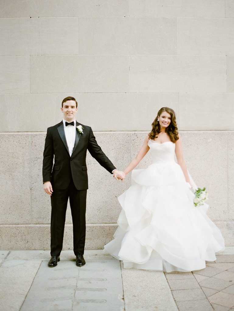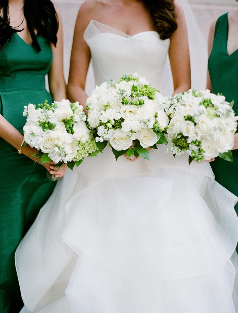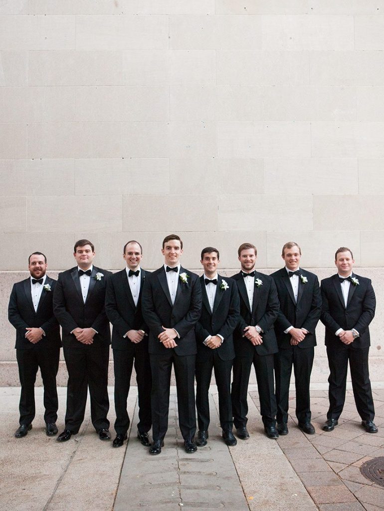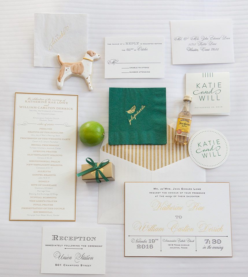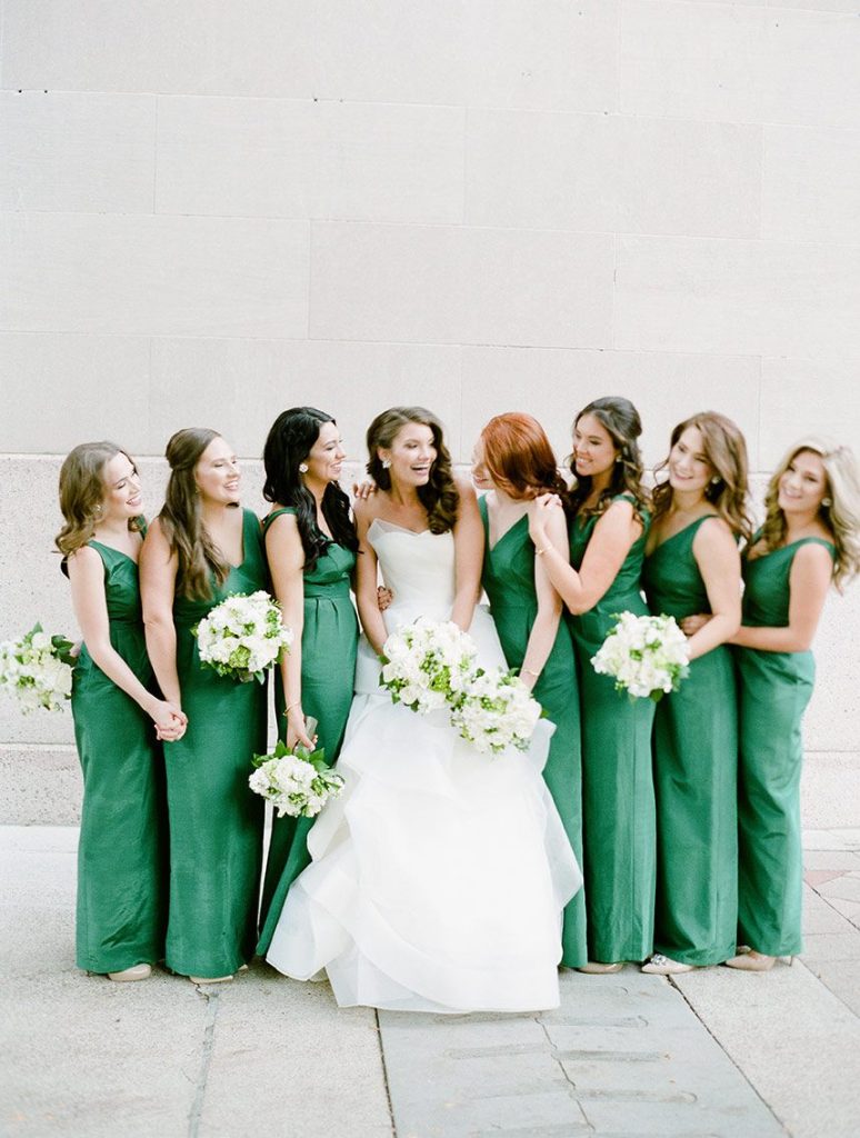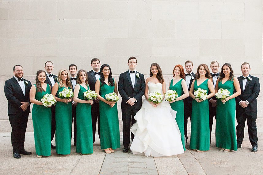 Every luxe detail from Katie and Will’s emerald green Union Station Houston wedding has us swooning! Planned by the incredible Keely Thorne Events, the couple’s ballpark wedding went off without a hitch. Kelli Durham Photography set to work capturing every extravagant scene filled with towering white florals by Blooming Gallery, boxwood hedge walls and stylish furniture rentals. Bride Katie looked incredibly stunning in her Vera Wang ball gown from Casa De Novia with an Old Hollywood inspired beauty look from The Styling Stewardess. The bridesmaids’ gowns from Bella Bridesmaids truly brought the color scheme to life with their vibrant emerald shine standing next to the couple as they said their vows. The celebrations continued into the evening as guests enjoyed cake sliced from the most incredible sugar flower-adorned cake by Who Made the Cake and danced the night away.