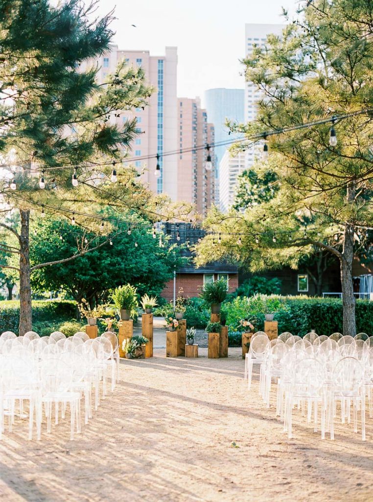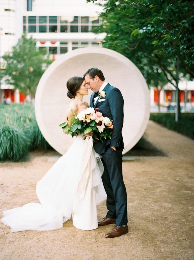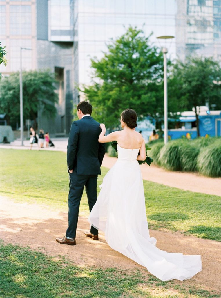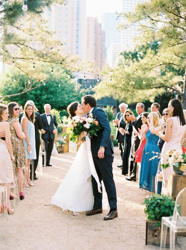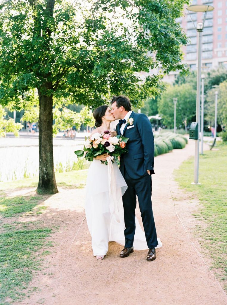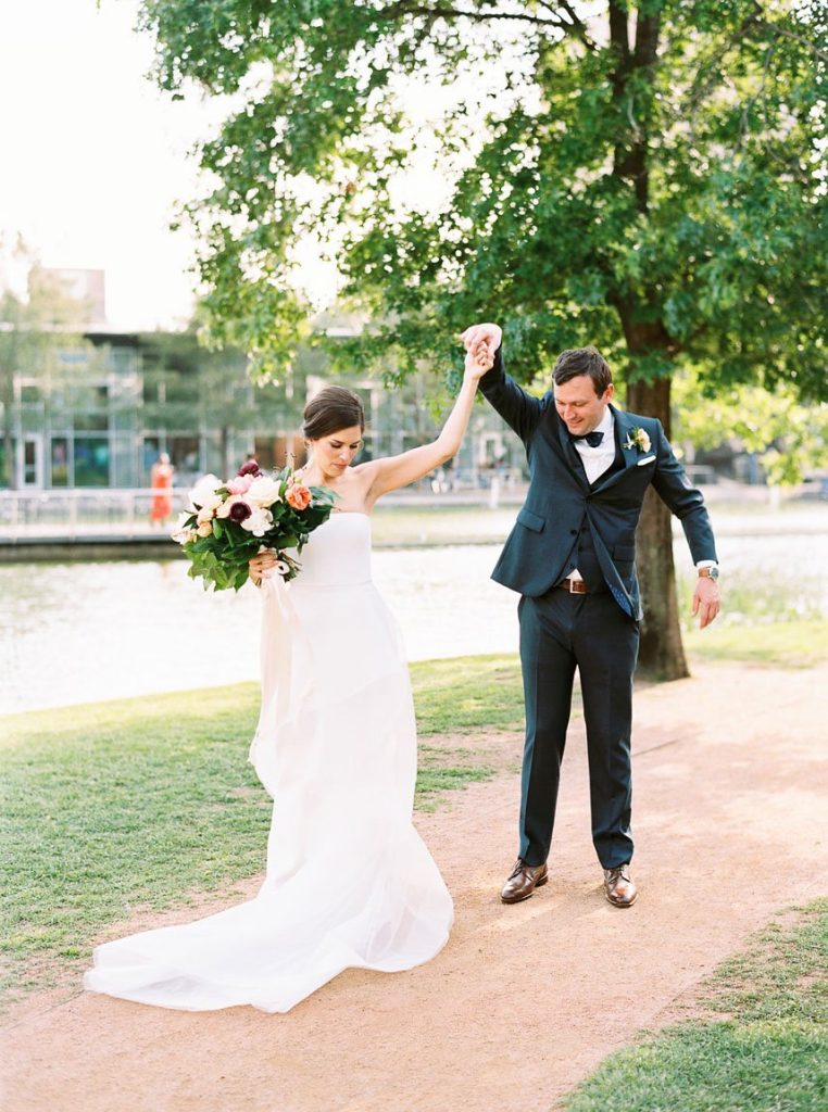 From the bride: “While wedding planning, I saw a lot of pictures of cake toppers that said, ‘Best Day Ever’ and while we didn’t use one of those cake toppers, that is exactly how I would describe the day! There had been rain in the forecast, but we ended up with perfect weather. Our friends and family got to spend the day in the hotel pool, in the park and around downtown. I spent the day getting ready with a bird’s eye view of Discovery Green and my best friends around to keep me laughing all afternoon. Jacque and I had a first look, and everything was smooth sailing from there. Our ceremony was just the right balance of formal and relaxed, and then we got the party started with a traditional New Orleans second line from Discovery Green to The Grove. Neither of us ever really like to be the center of attention, but we did attract an audience in the park that day, and it was so much fun to celebrate the start of our marriage in such a big way. We have a few musical friends who performed throughout the night, and otherwise Klockwork kept everyone on the dance floor until the very end, which is exactly how we wanted it! At the end of the night, we walked back to the Marriott wishing we could start it all over again.”