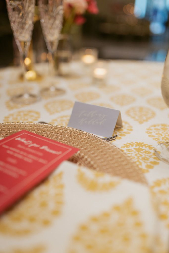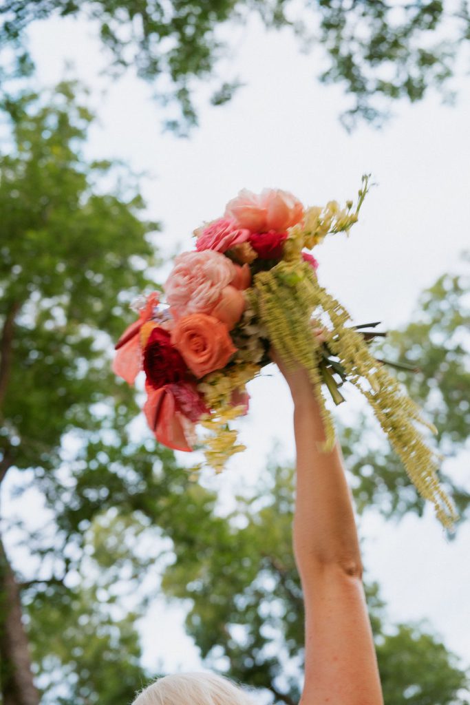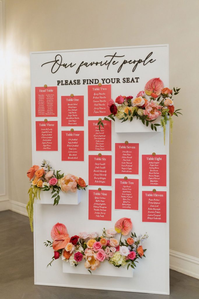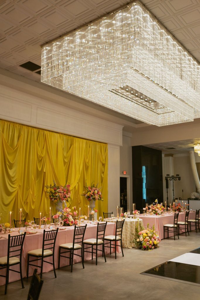The vibrant floral design by The Lilee Cottage stole the show—featuring cheerful peach, coral, and pink blooms that popped against the venue space. Coordinating linens and rentals from Bright Event Rentals, along with dreamy yellow draping and a black and white checkered dance floor provided by Elevated AV Production, set the stage for an evening on the dance floor.