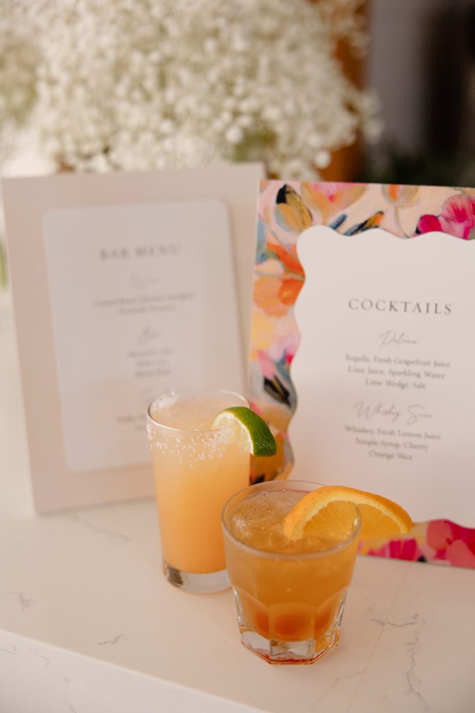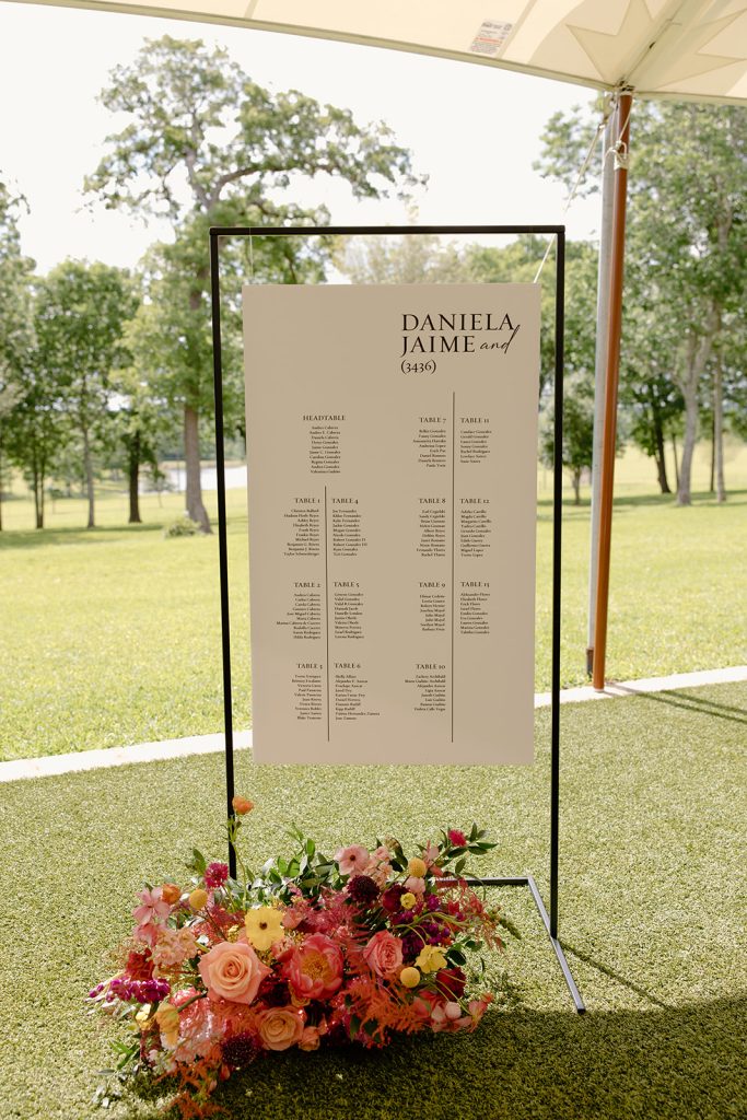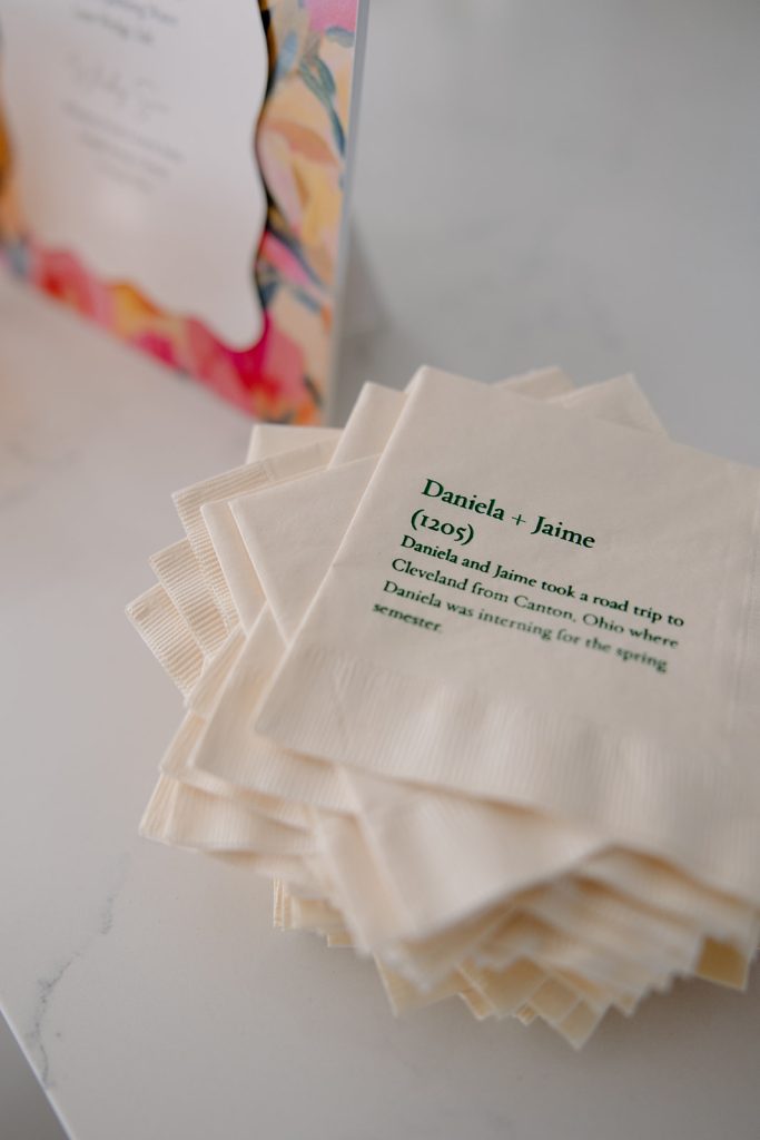 Inspired by this part of their love story, the couple created a custom cocktail napkin design that highlights relationship milestones with the corresponding day in Daniela and Jaime’s dating timeline!