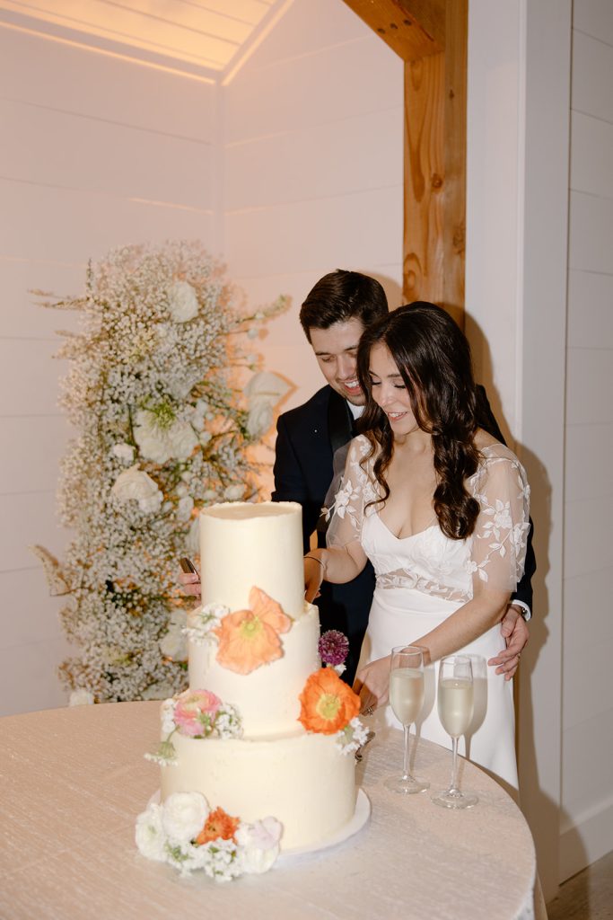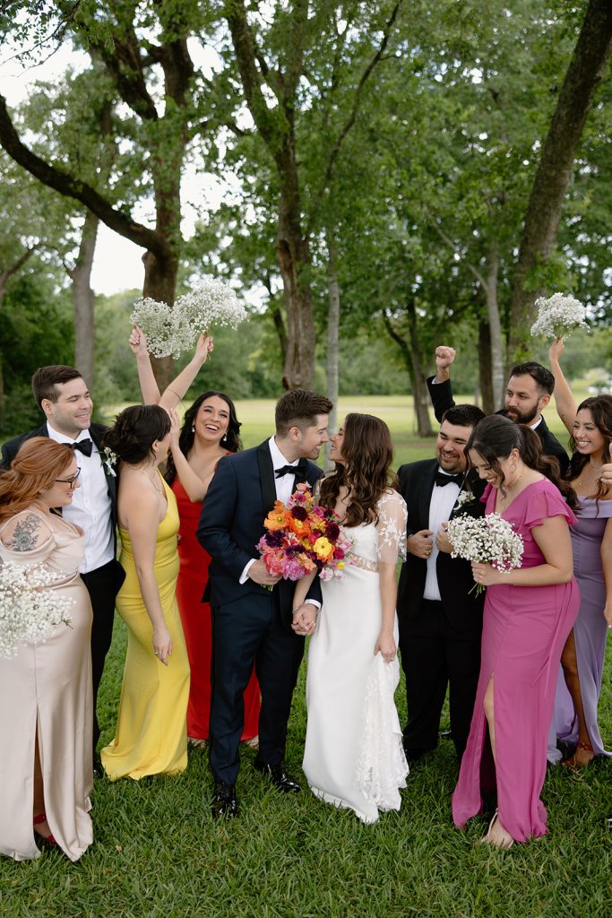 Along with tree-lined Texas hills and a cool springtime breeze, the couple’s wedding was complete with flowers from Unforgettable Floral. Baby’s breath and white roses paired with vibrant pops of orange, yellow and pink made for memorable use of colors. The wedding was made complete with decor and rentals from BBJ La Tavola, adding touches of springtime flair to the couple’s reception.