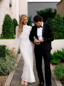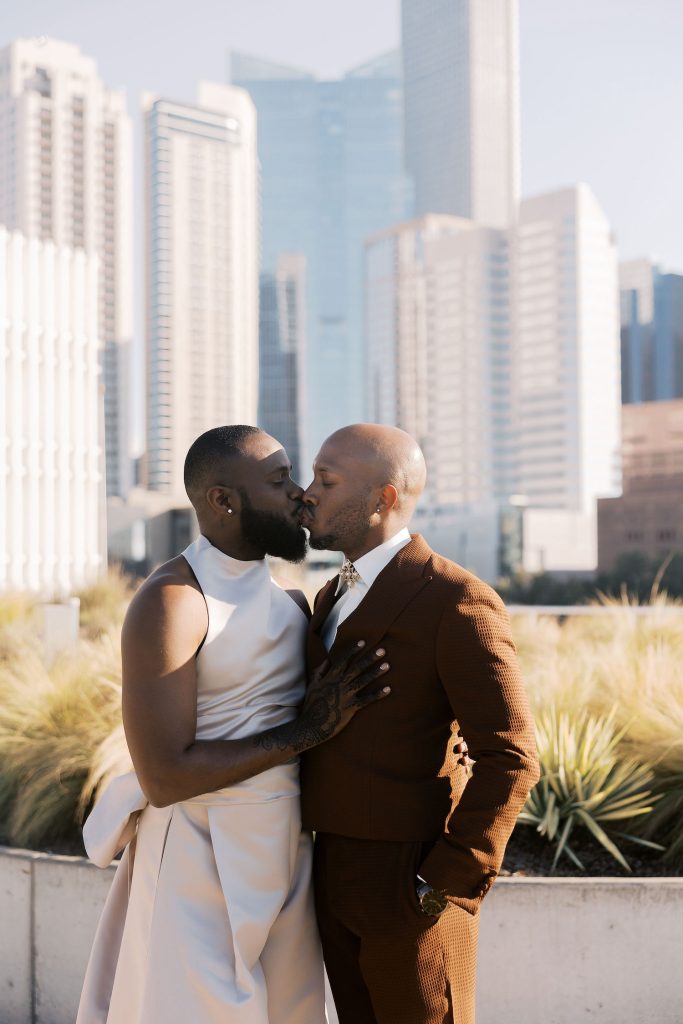 The celebration took place at the iconic POST Houston, a venue sitting right in the heart of downtown. Having said “I do” privately in a rose garden months prior, the couple used their Houston reception to throw an unforgettable party where the city skyline served as a dramatic, perfect backdrop for their portraits.