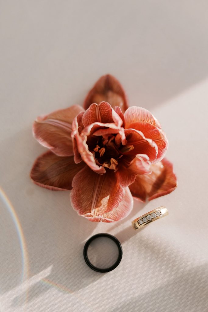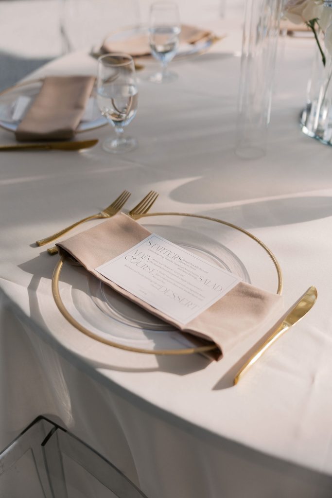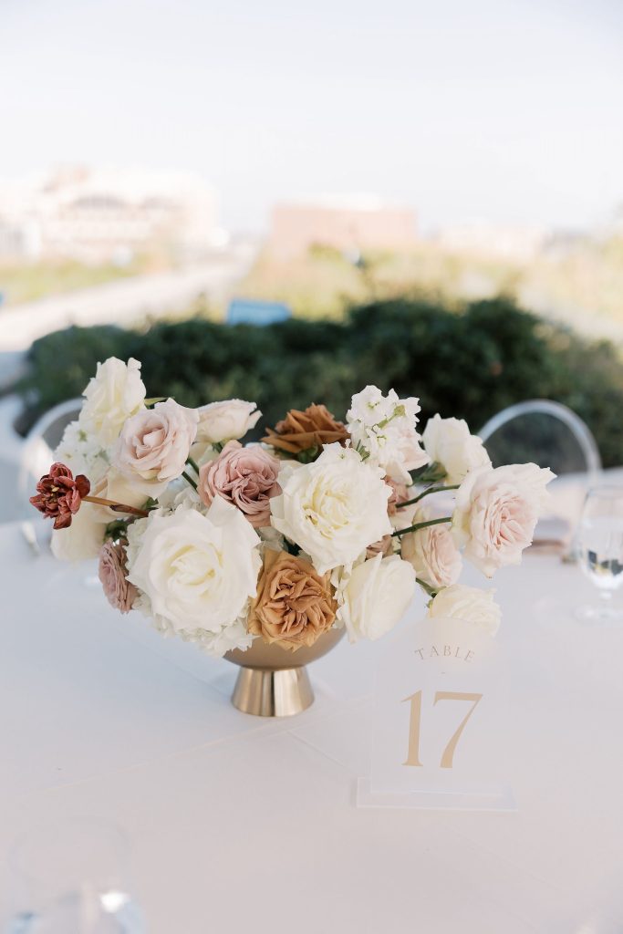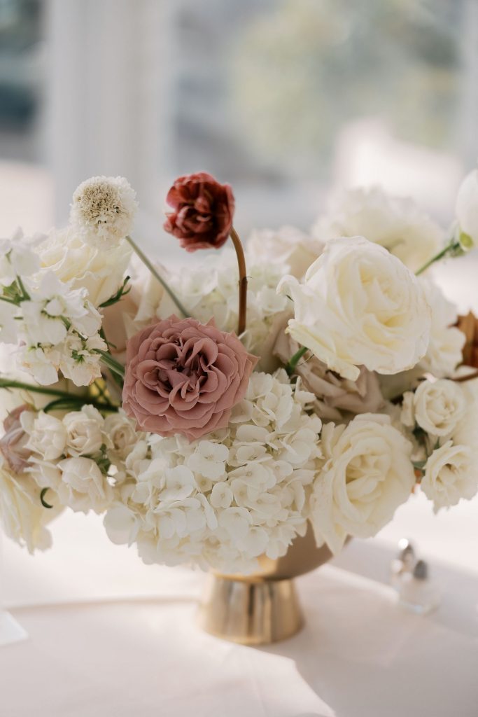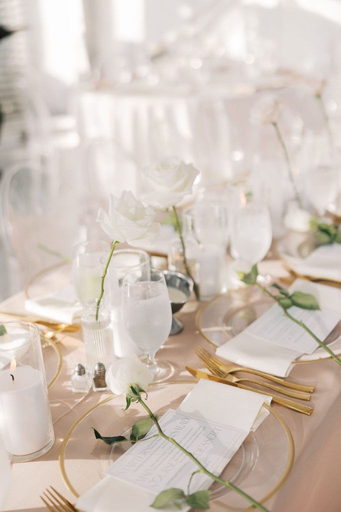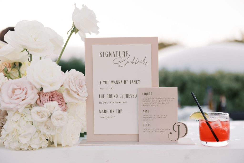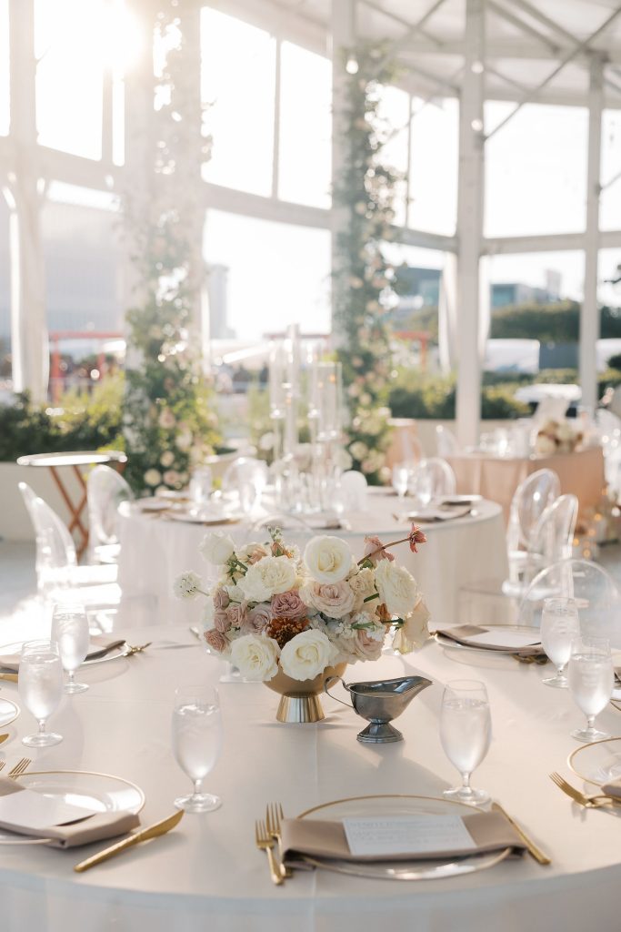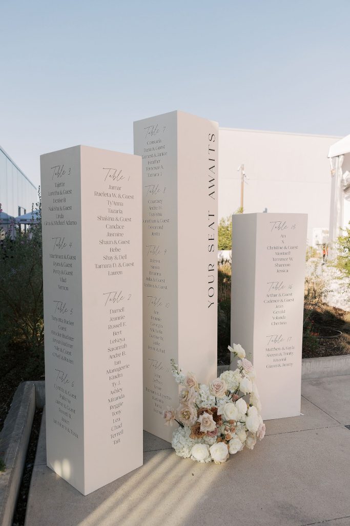The visual transformation of the industrial space was led by Luxe Event Design Firm, who curated the sophisticated decor and rentals, from modern seating to the elegant cocktail hour setup. Wanderie Floral Studio brought a romantic softness to the urban venue with lush, towering floral pillars and delicate bud vases in creamy tones. Adding to the sleek aesthetic, AALVO provided custom signage and those essential personal touches like the bar menus and napkins.
