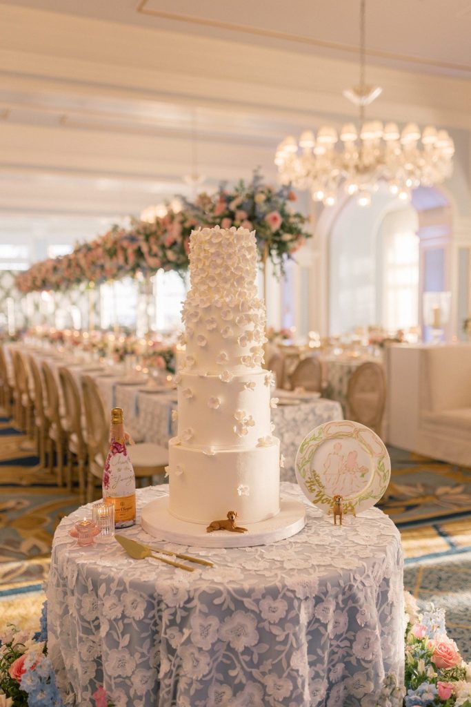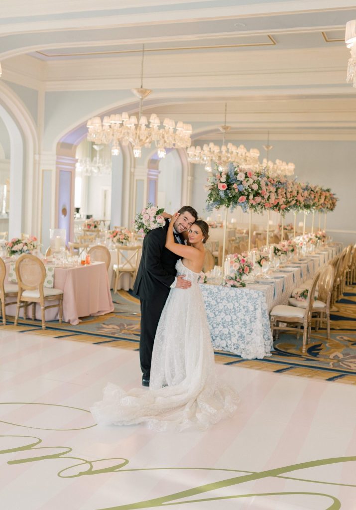 The reception space was illuminated by Elevated AV Production, creating the perfect ambiance for their celebration. Guests enjoyed a delicious meal followed by a show-stopping wedding cake by Cakes by Gina – a multi-tiered masterpiece adorned with delicate flowers cascading down the sides, as stunning as it was delicious.