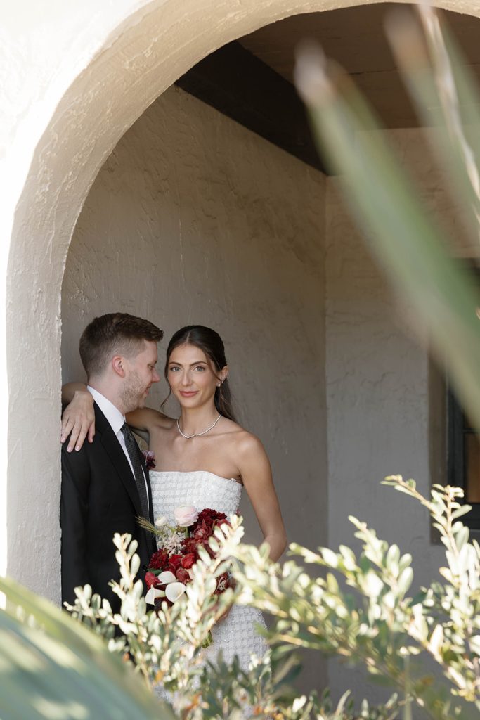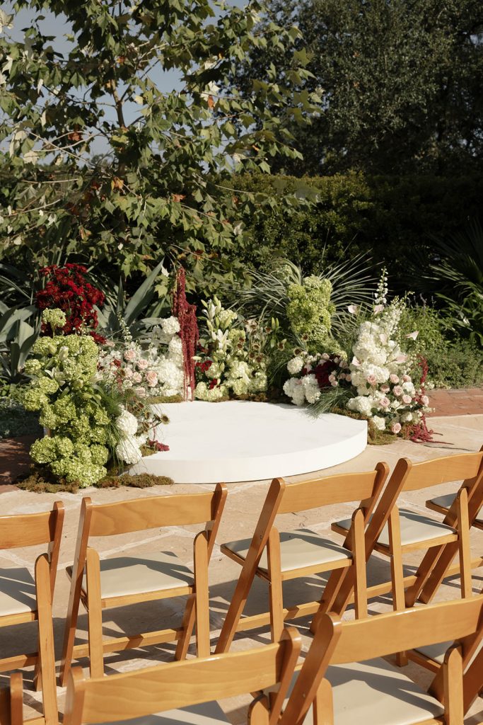 Avery & Clay’s celebration at Lott Hall blended classic design with a relaxed, open-air feel that made the entire day feel intentional and welcoming. Their ceremony took place outdoors, framed by lush, organic florals from Amor Del Bueno Flowers. A curved white platform surrounded by layered blooms in soft blush, ivory, and deep red tones created a ceremony space that felt modern yet romantic.