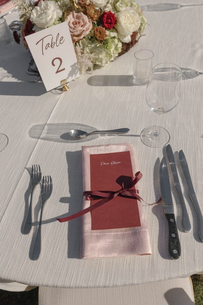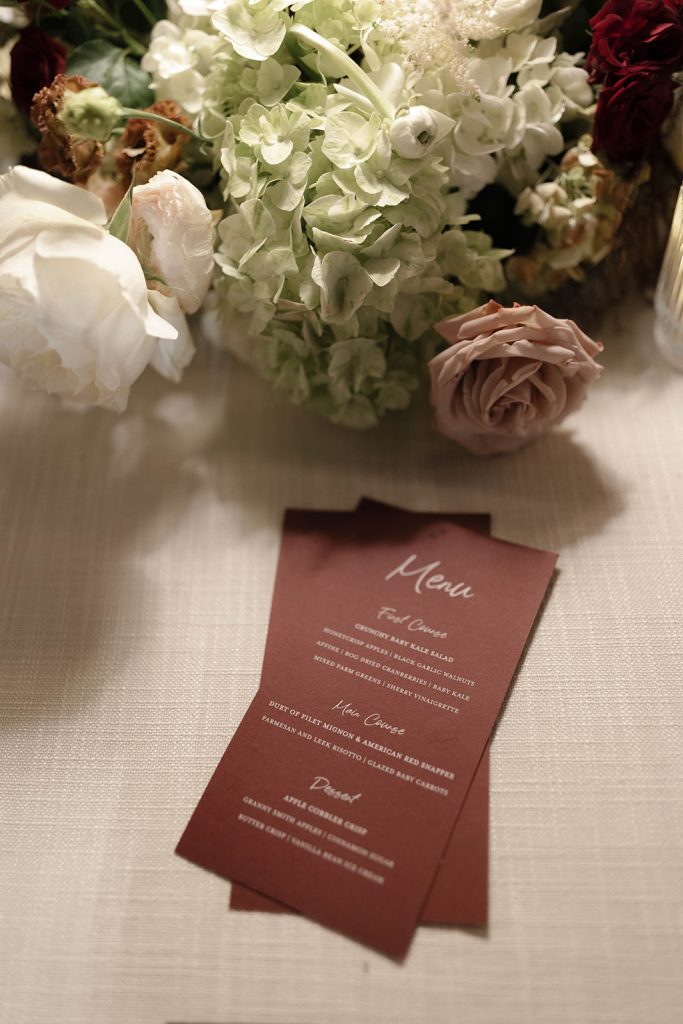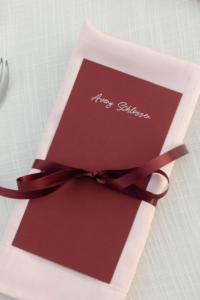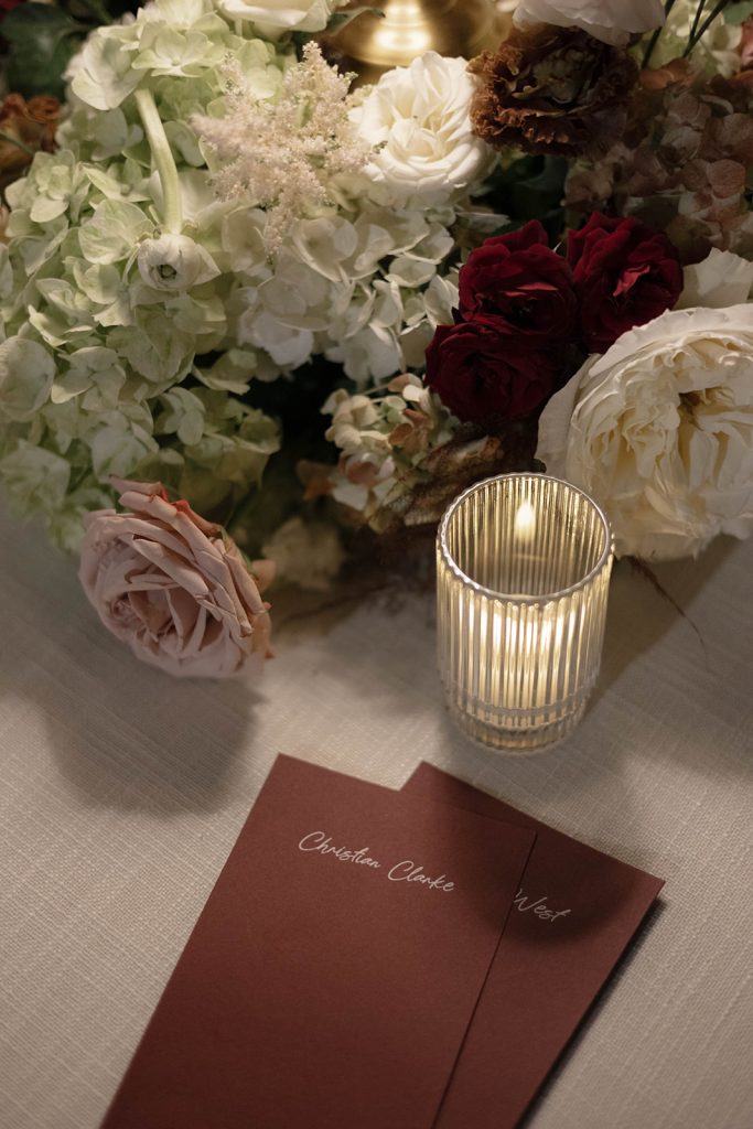 Paper goods by DGZ Invitations and More added a thoughtful, personal layer to the design. Raised ink menus, place cards, and table numbers brought in a tactile, elevated feel, while custom cocktail napkins featured handwritten notes from Avery and Clay to their guests—one of those small details that made a lasting impression.