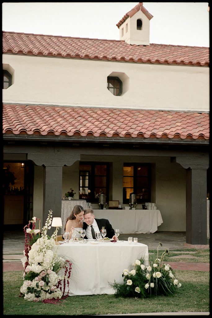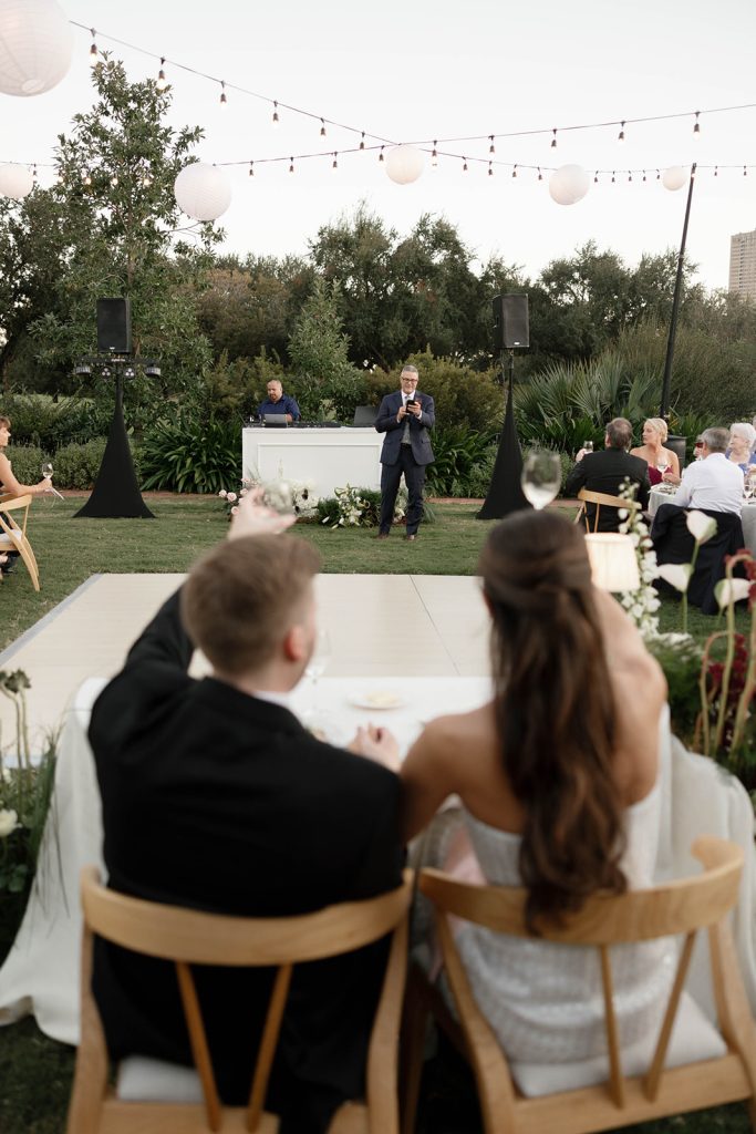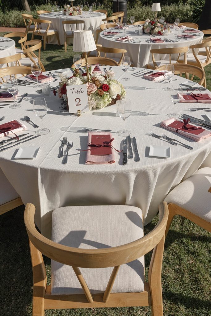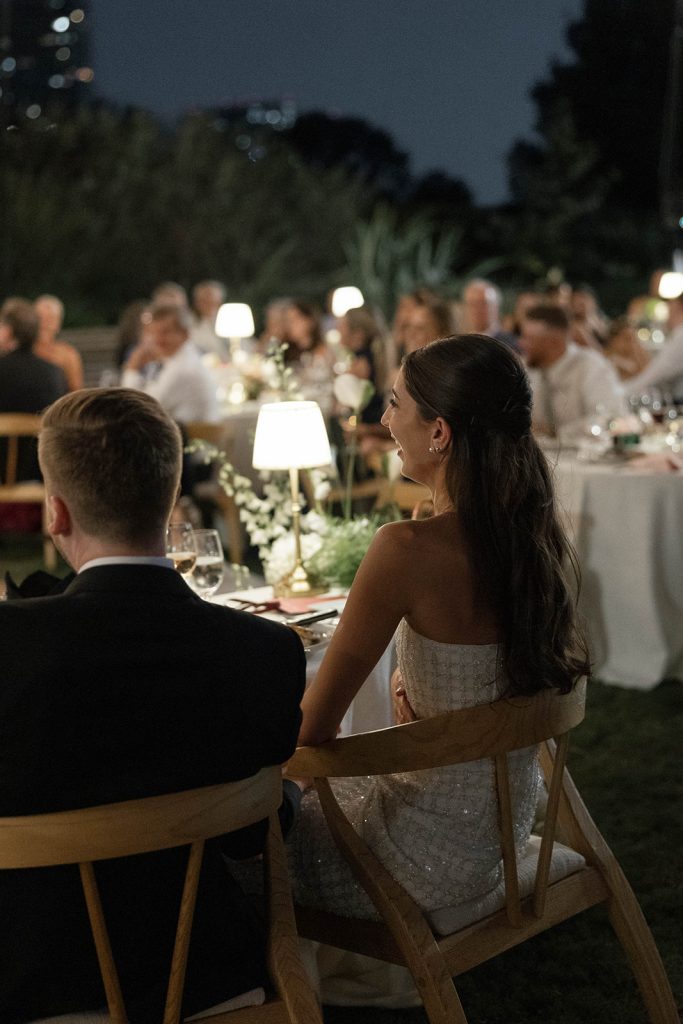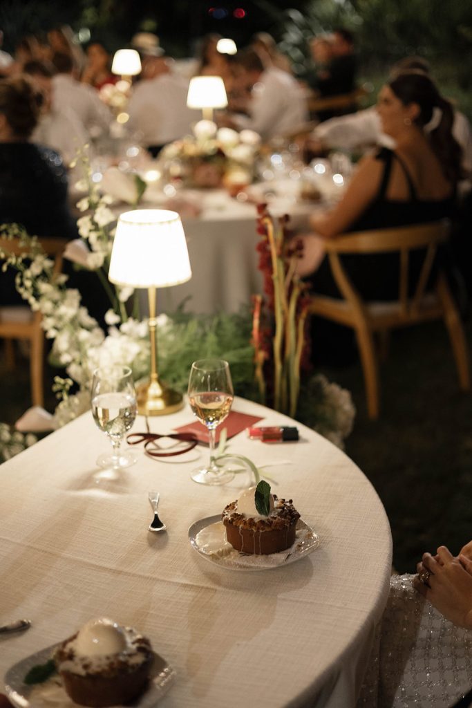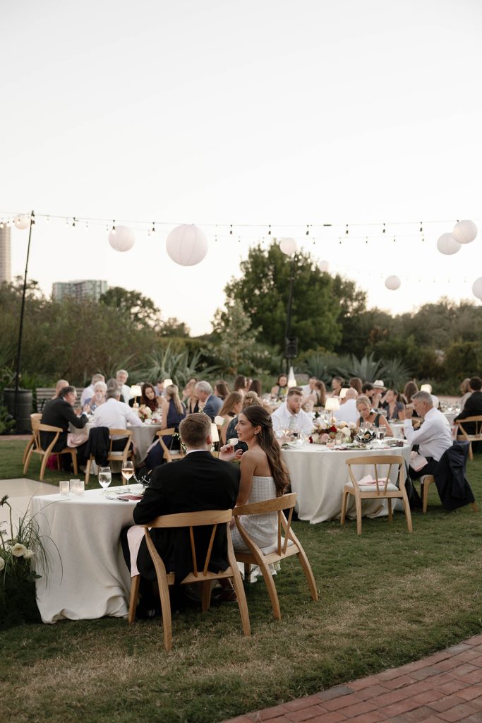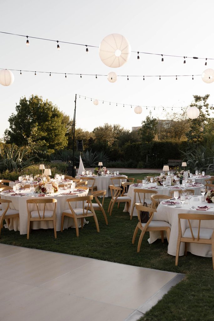 Following the ceremony, guests transitioned into an al fresco reception that truly set the tone for the evening. Wooden chairs from Bright Event Rentals added warmth to the space, pairing effortlessly with soft linens, layered place settings, and thoughtfully styled tabletop details that gave the reception an elevated but approachable feel. Long and round tables were styled with low, lush arrangements and soft lighting, while delicate table lamps added an unexpected and intimate touch as the sun began to set.