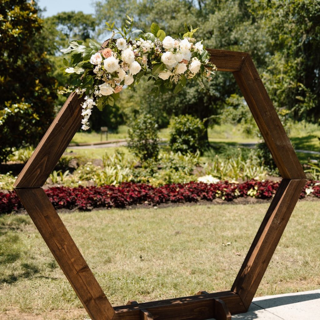 Add a few clusters of florals to your hexagon wedding arch or cover the entirety of it in blooms! The choice is totally yours and this is a ceremony setup that looks just as lovely indoors as it does out and about. For minimalistic modern romance, we highly recommend a hexagon wedding arch with flowers in the color of your choice.