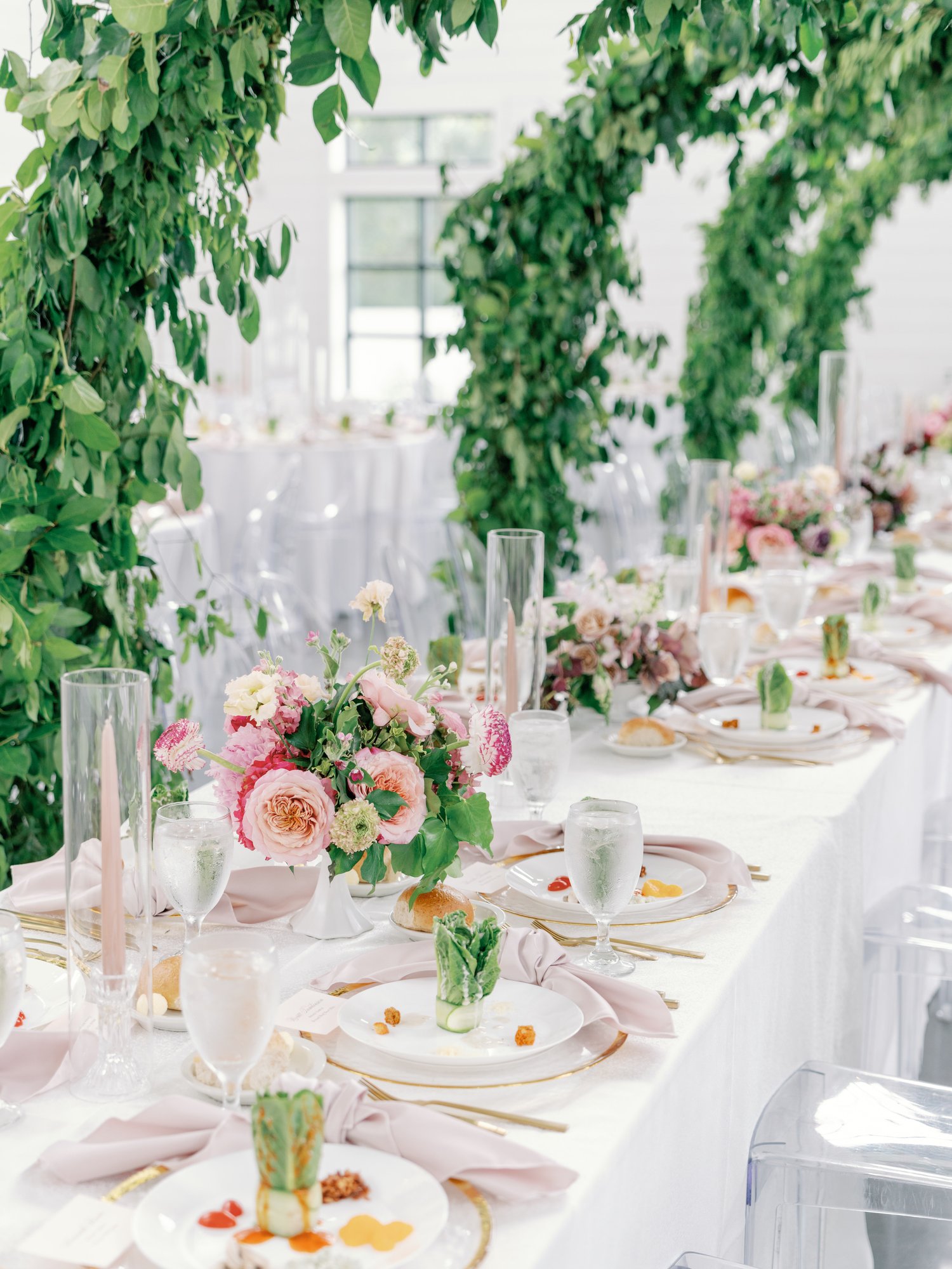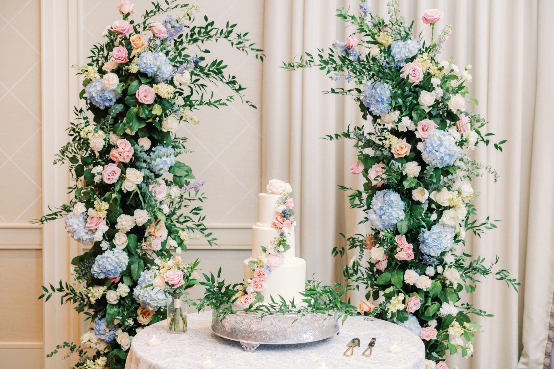 Perfect for highlighting one of the sweetest moments of your celebration, a floral arch over the cake display adds a touch of elegance and romance to your reception. Picture lush blooms and trailing greenery gracefully framing the cake table, turning it into a captivating focal point. This stunning detail not only enhances your décor but also creates a picture-perfect backdrop for one of your most memorable photo ops.