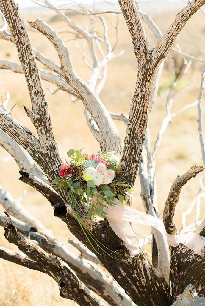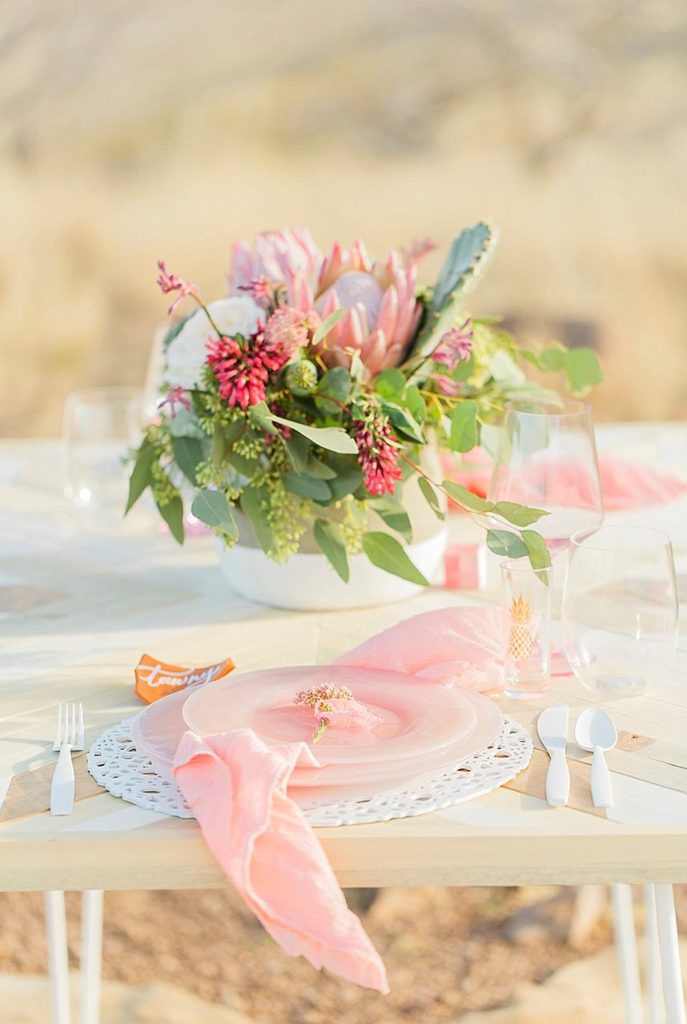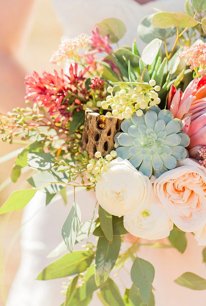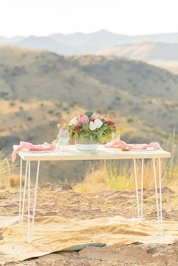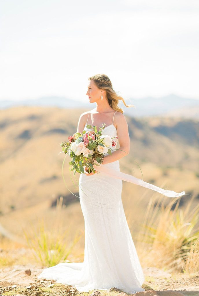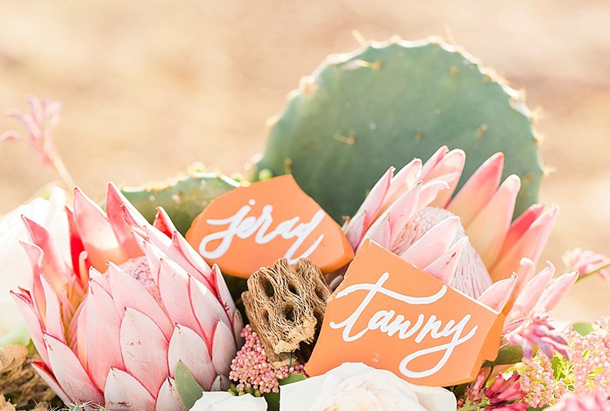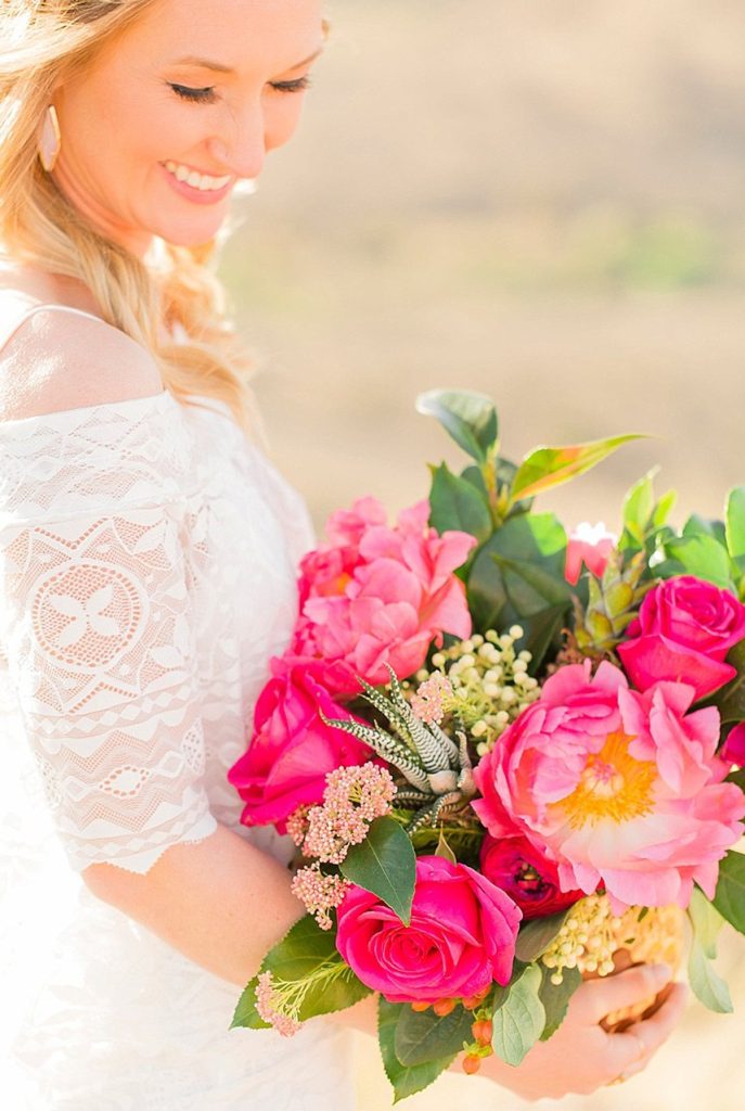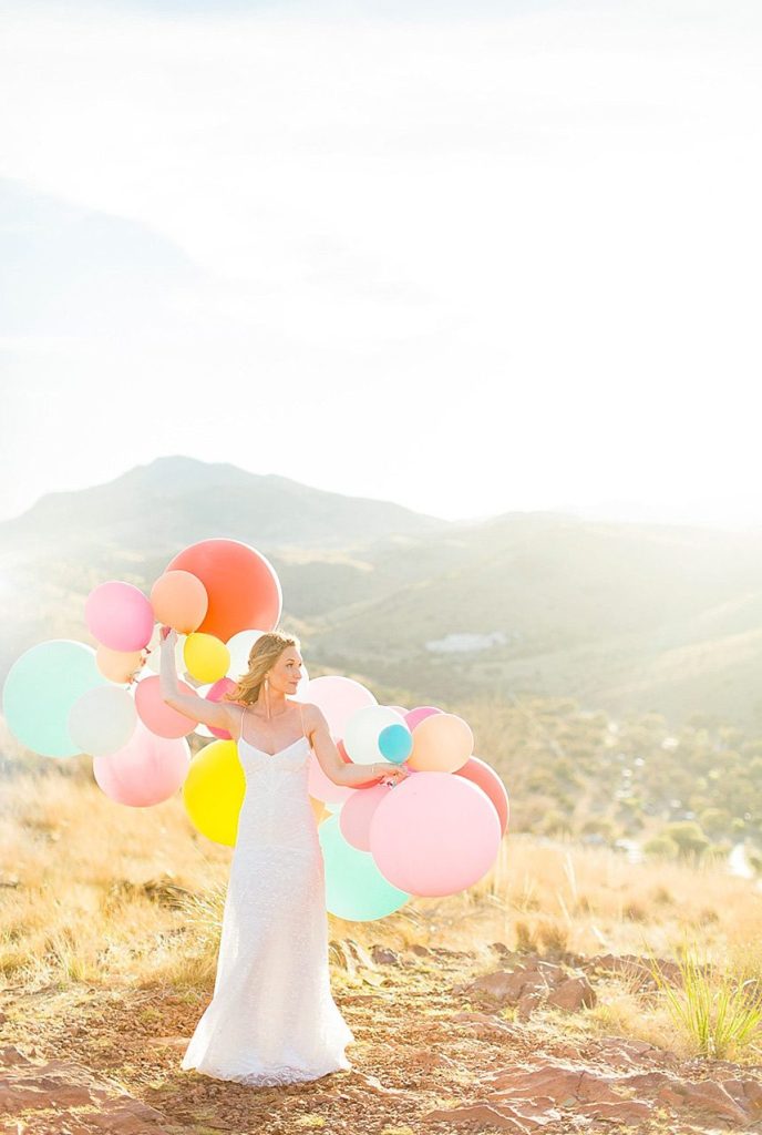 In designing the photoshoot we chose bold colors such as terracotta orange, bright pinks, and an emerald green which complimented Tawny’s eyes beautifully. Drawing inspiration from the desert setting itself we incorporated lots of cactus, succulents, and protea in the floral. In keeping with the boho feel, Lovely Bride provided the perfect dress to fit Tawny’s personality and the overall look we were going for. To honor the couple’s original request of vibrant colors, Cake and Confetti styled a super fun balloon garland. And let me tell you,  having this gorgeous couple in front of the bright garland with the mountains in the background is what dreams are made of!”