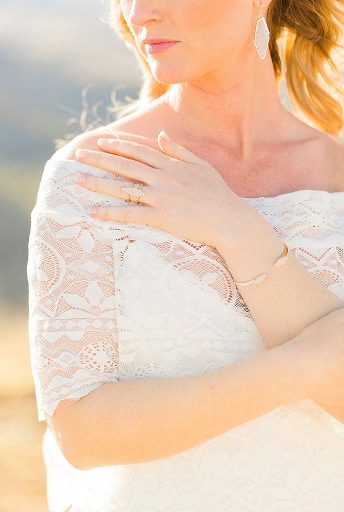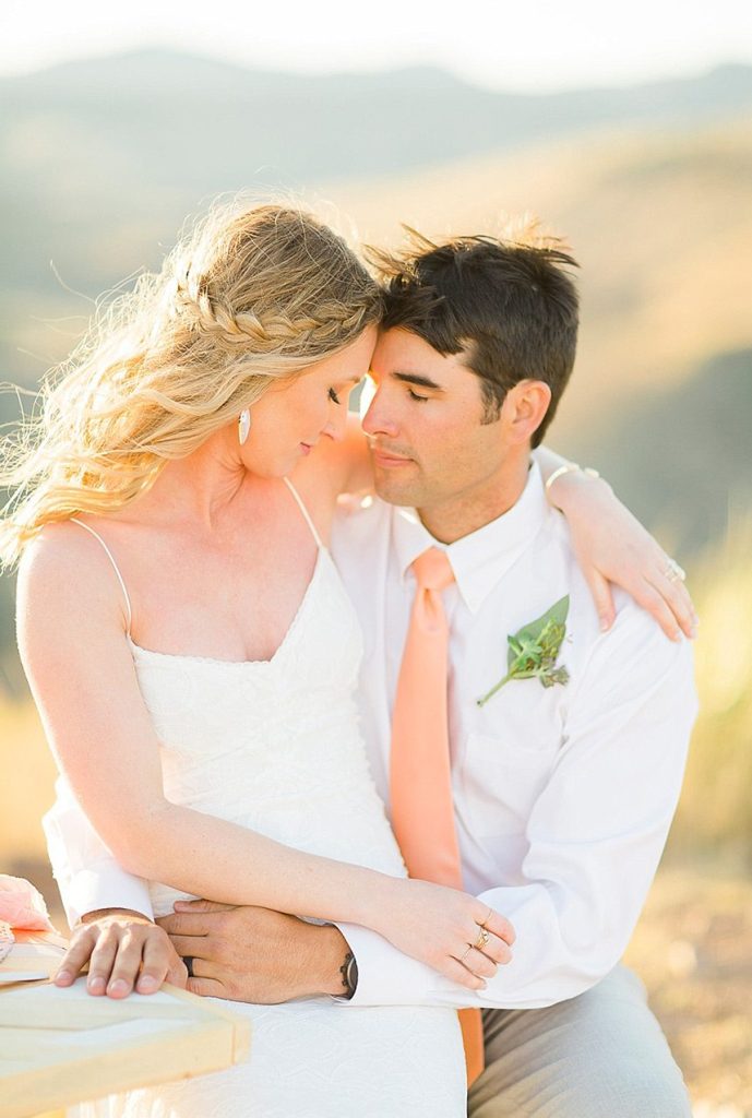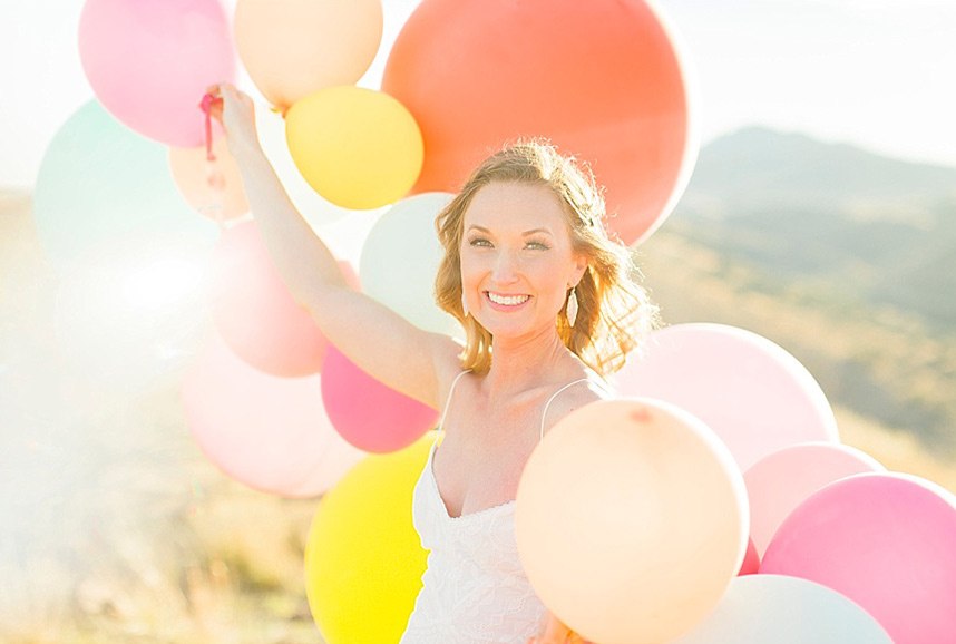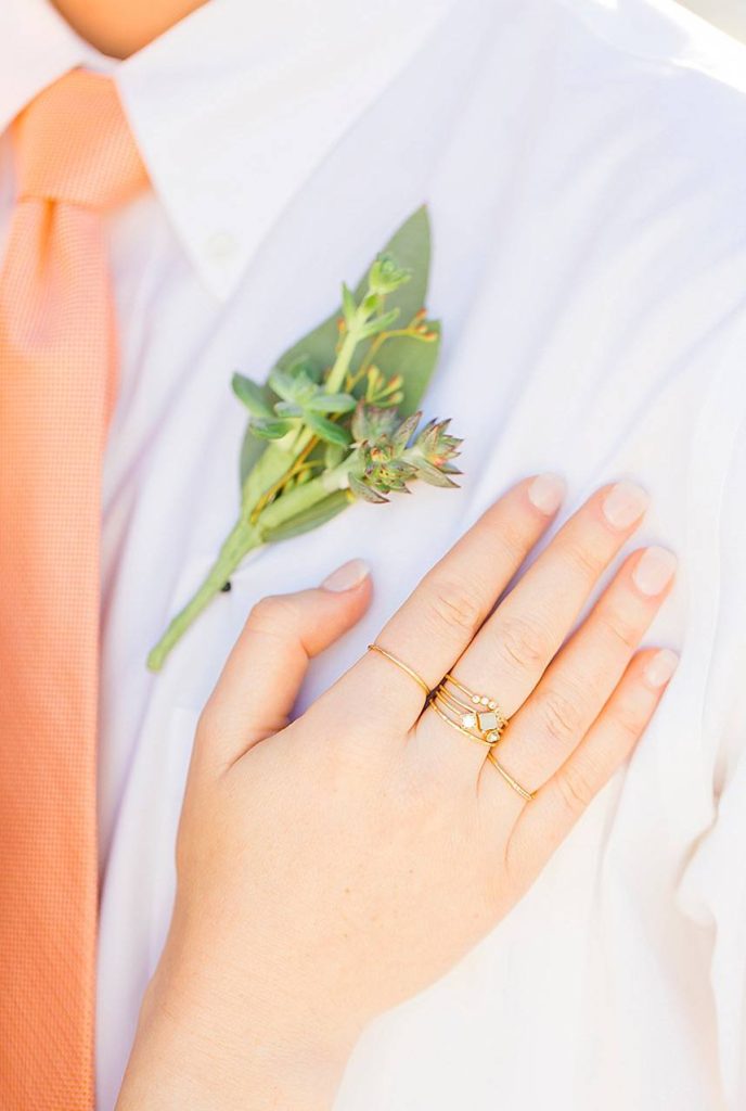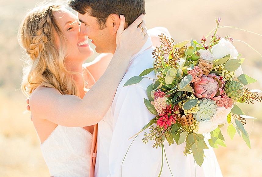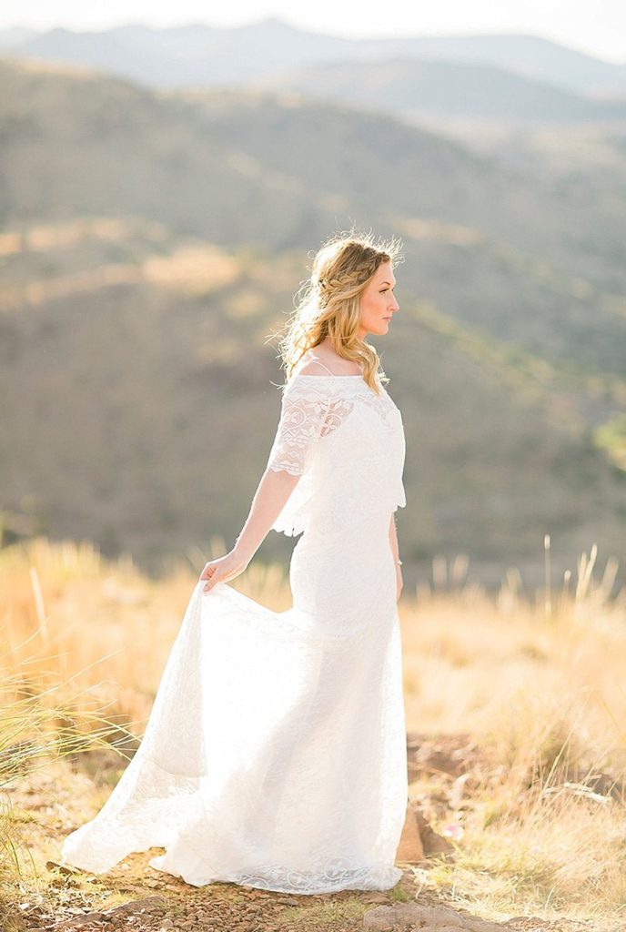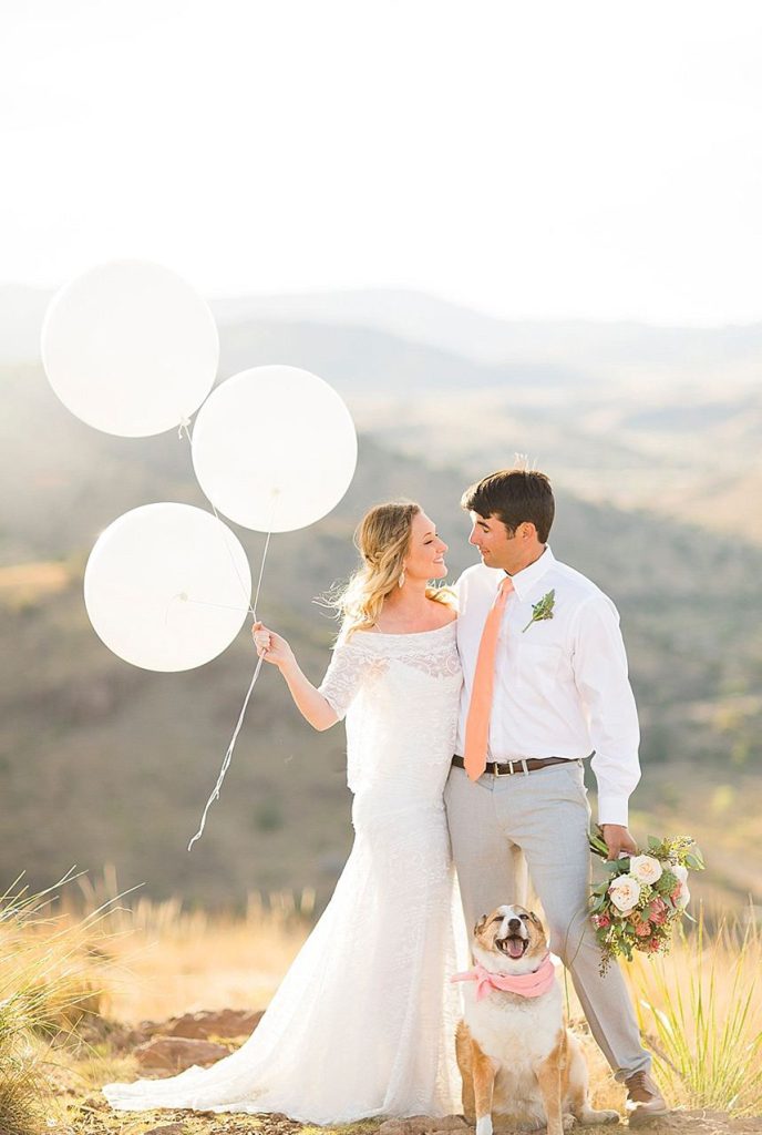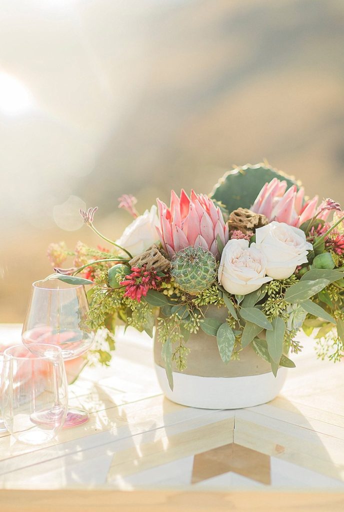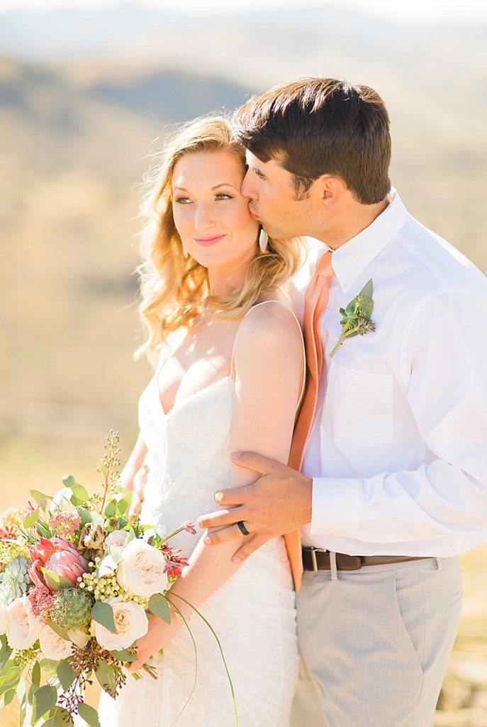 In designing the photoshoot we chose bold colors such as terracotta orange, bright pinks, and an emerald green which complimented Tawny’s eyes beautifully. Drawing inspiration from the desert setting itself we incorporated lots of cactus, succulents, and protea in the floral. In keeping with the boho feel, Lovely Bride provided the perfect dress to fit Tawny’s personality and the overall look we were going for. To honor the couple’s original request of vibrant colors, Cake and Confetti styled a super fun balloon garland. And let me tell you,  having this gorgeous couple in front of the bright garland with the mountains in the background is what dreams are made of!”
