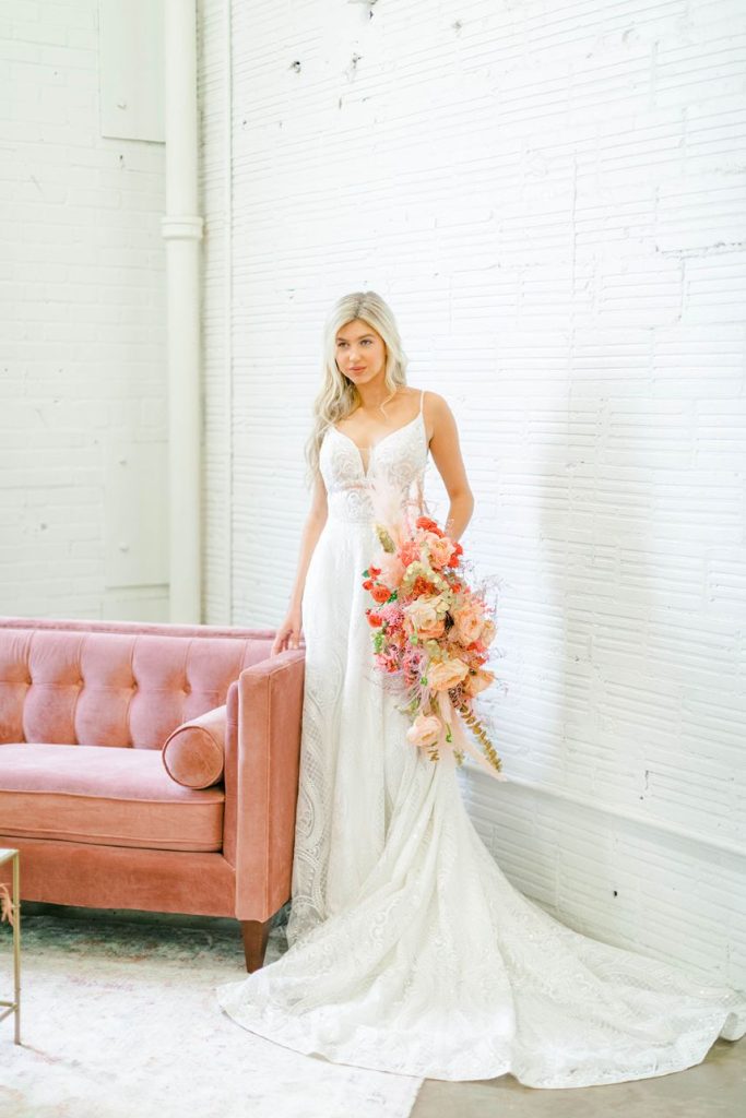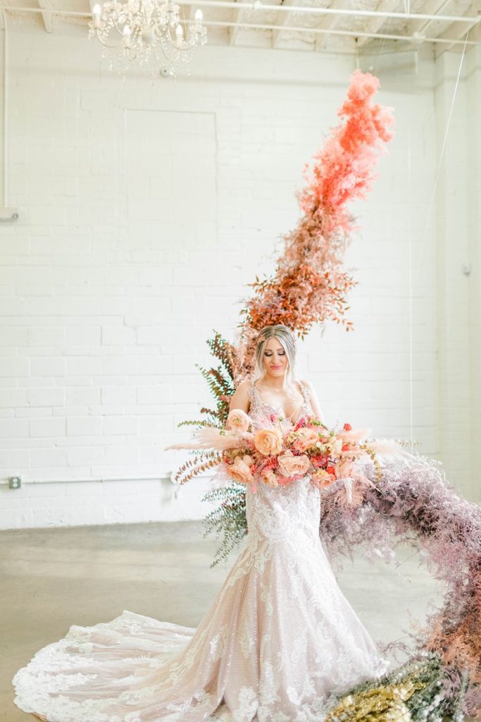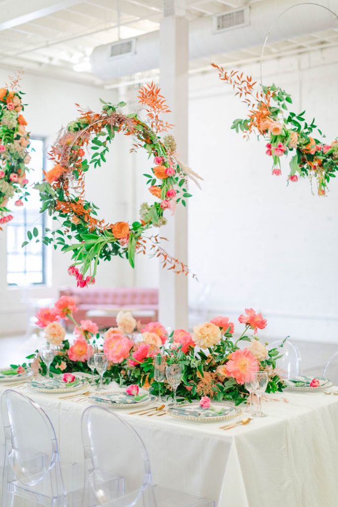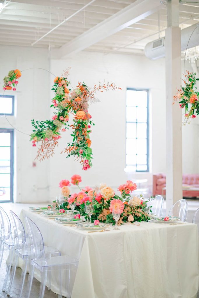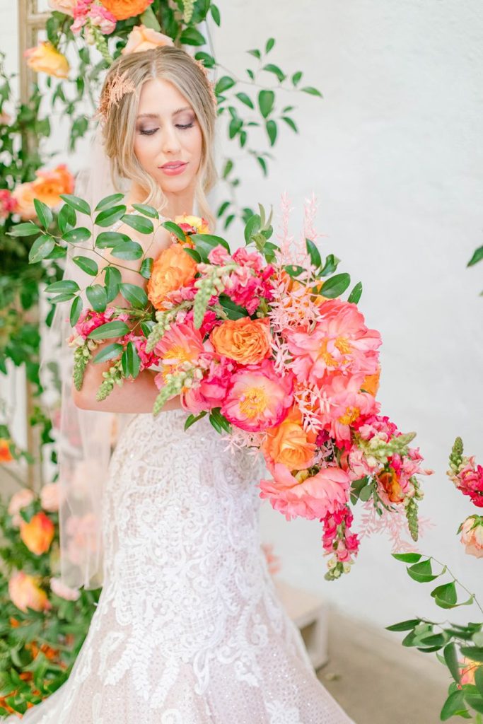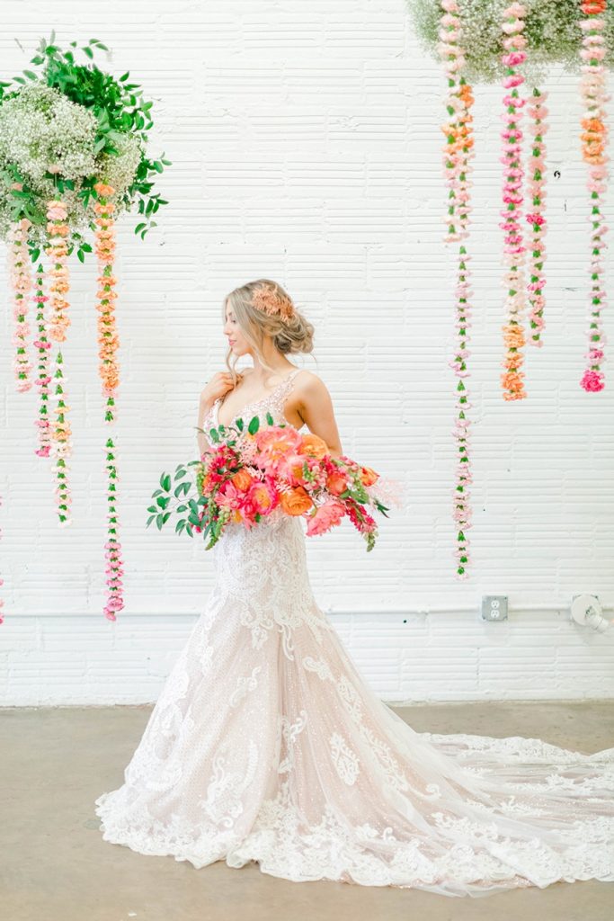 There’s nothing quite as fresh and fun as this whimsical wedding inspiration! Perfect for the bohemian bride or anyone who isn’t afraid to take the path less traveled, this styled shoot combines some of the sweetest vintage pieces and trendiest new rentals from Love Birds & Co. with so much romantic floral design to create a dream wedding scene in bold coral and peach shades. Half Moon Lettering has created an invitation suite that is just as bright and punchy as the rest of this big day, and we love the abstract watercolor design! Two models showcase jaw-dropping gowns from Brickhouse Bridal, both with gorgeous sweeping trains and intricate, feminine detail that is absolutely to-die-for! Both brides look flawless with hair and makeup artistry by Sunkissed and Made Up – pros at creating glowy and natural bridal looks that look straight off the red carpet. A carefully crafted, four-tiered wedding cake in shades of orange by Cakes by Gina has our mouths watering and also functions as the perfect statement décor in a room (until there’s none left)! Lighting, courtesy of LG Event Entertainment & Production, means that every shot in this gallery is a keeper, and all photos have the perfect balance of natural light and vivid color. For all its bright and fun elements, we just can’t get enough of this whimsical wedding inspiration that is absolutely perfect for the bohemian bride in your life. Cheers!