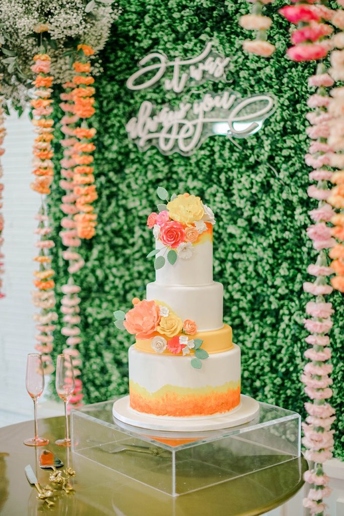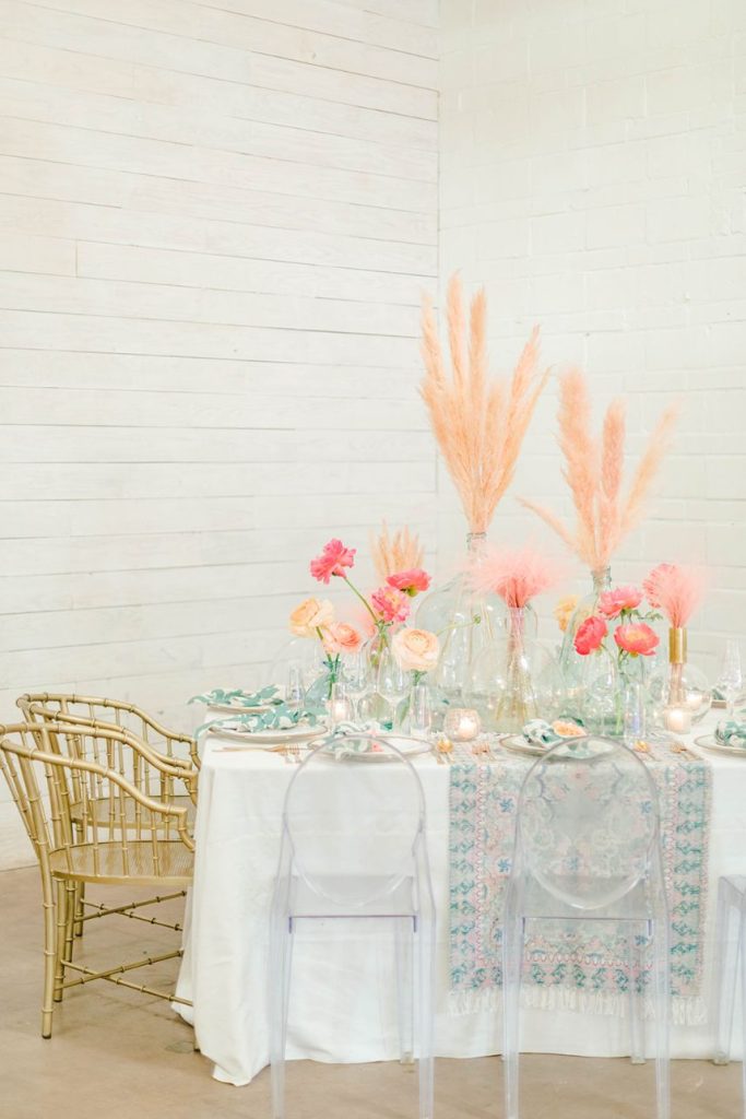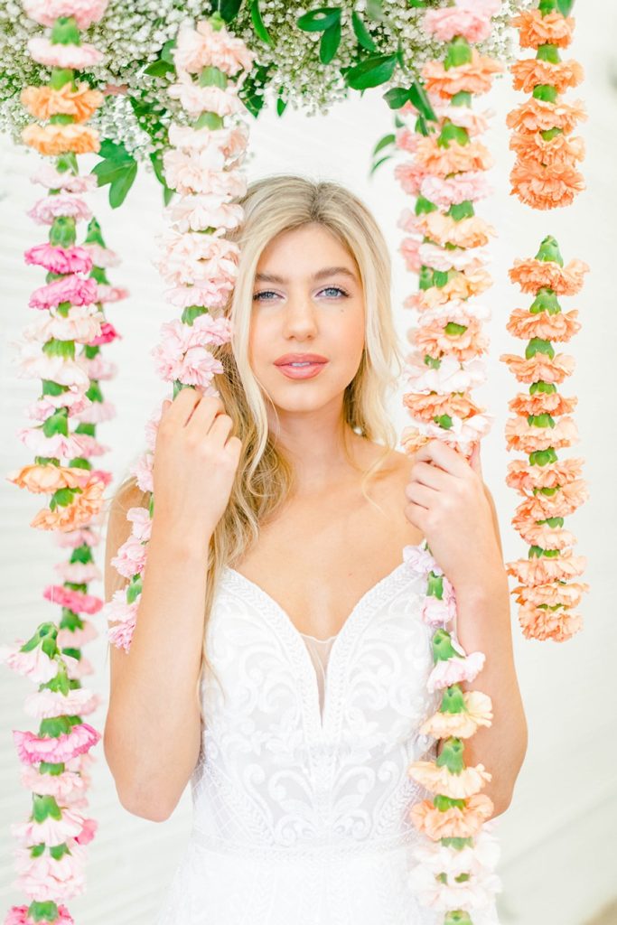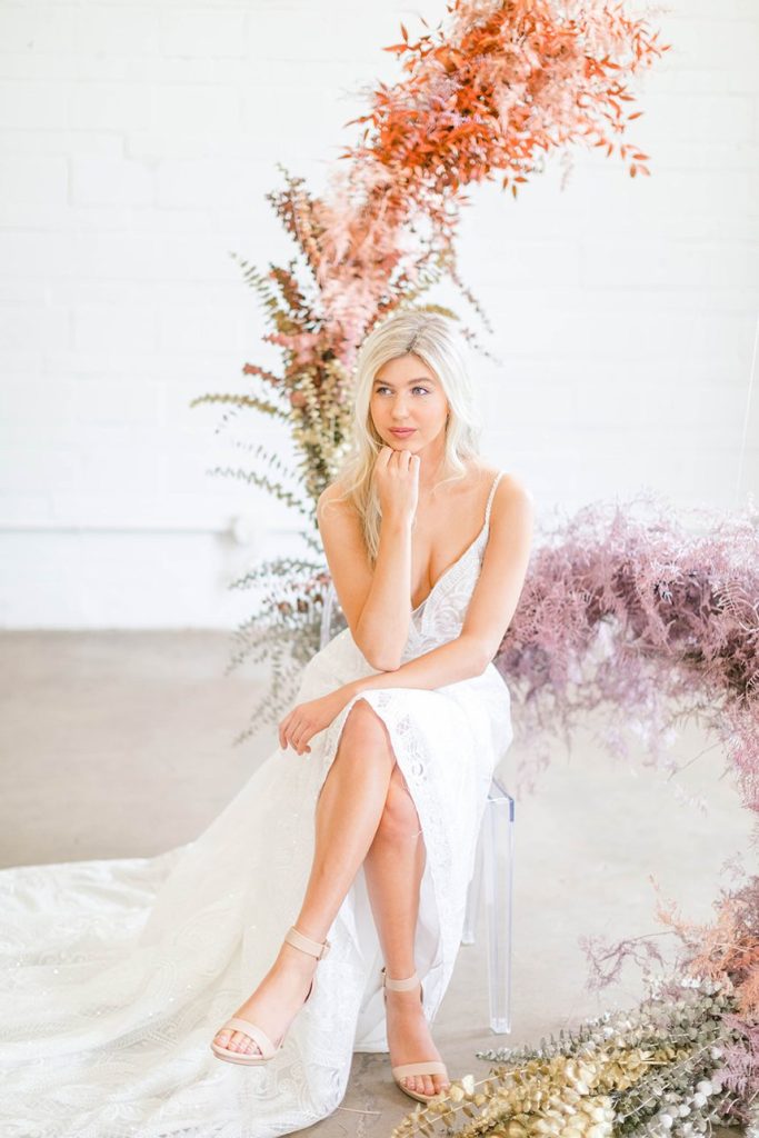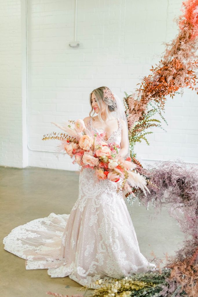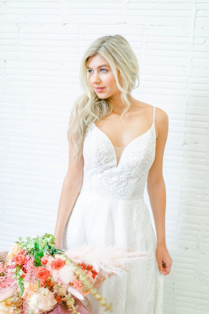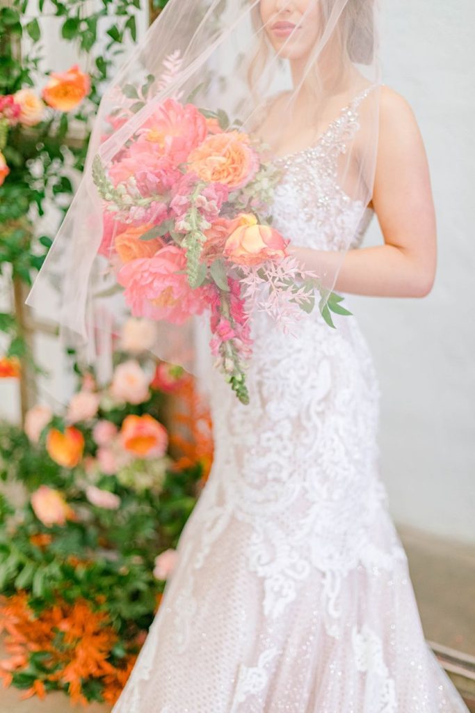 There’s nothing quite as fresh and fun as this whimsical wedding inspiration! Perfect for the bohemian bride or anyone who isn’t afraid to take the path less traveled, this styled shoot combines some of the sweetest vintage pieces and trendiest new rentals from Love Birds & Co. with so much romantic floral design to create a dream wedding scene in bold coral and peach shades. Half Moon Lettering has created an invitation suite that is just as bright and punchy as the rest of this big day, and we love the abstract watercolor design! Two models showcase jaw-dropping gowns from Brickhouse Bridal, both with gorgeous sweeping trains and intricate, feminine detail that is absolutely to-die-for! Both brides look flawless with hair and makeup artistry by Sunkissed and Made Up – pros at creating glowy and natural bridal looks that look straight off the red carpet. A carefully crafted, four-tiered wedding cake in shades of orange by Cakes by Gina has our mouths watering and also functions as the perfect statement décor in a room (until there’s none left)! Lighting, courtesy of LG Event Entertainment & Production, means that every shot in this gallery is a keeper, and all photos have the perfect balance of natural light and vivid color. For all its bright and fun elements, we just can’t get enough of this whimsical wedding inspiration that is absolutely perfect for the bohemian bride in your life. Cheers!