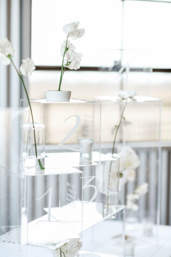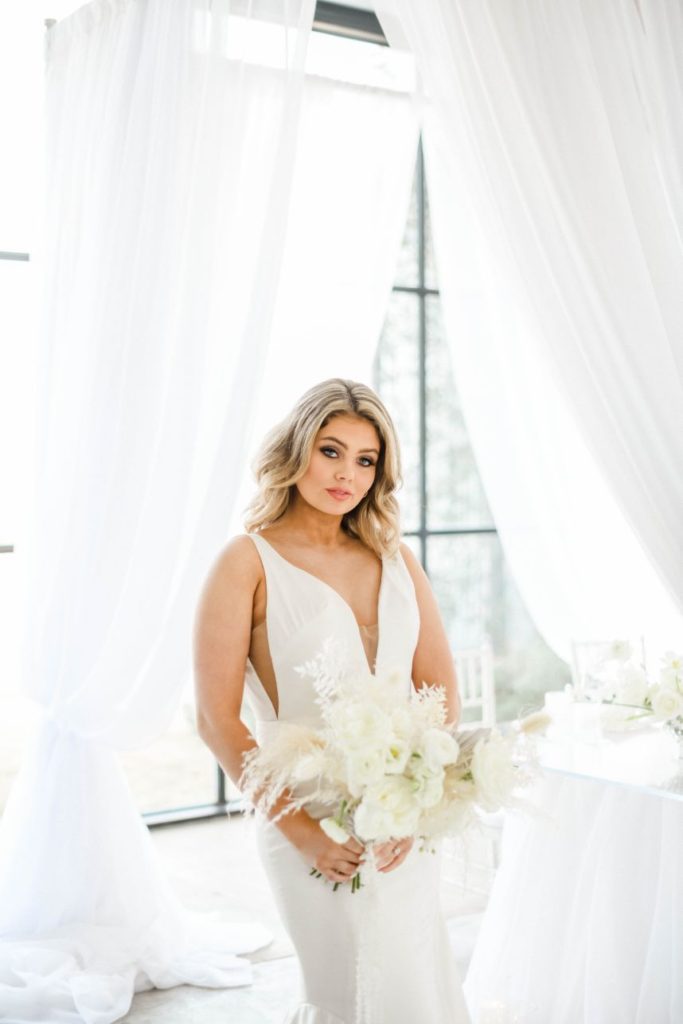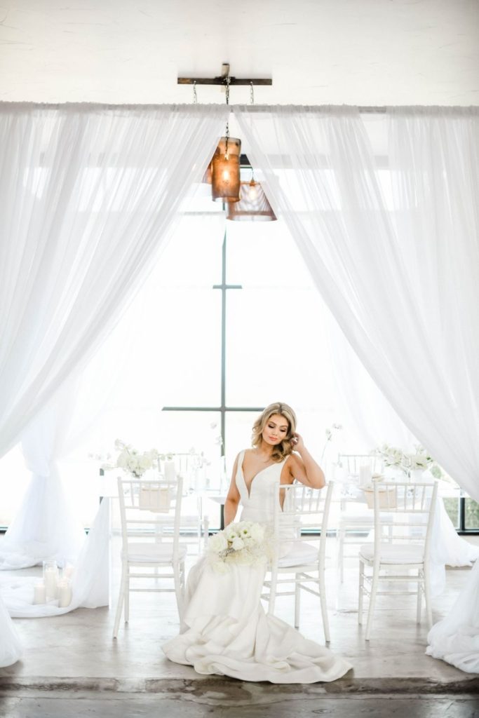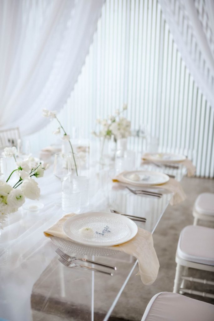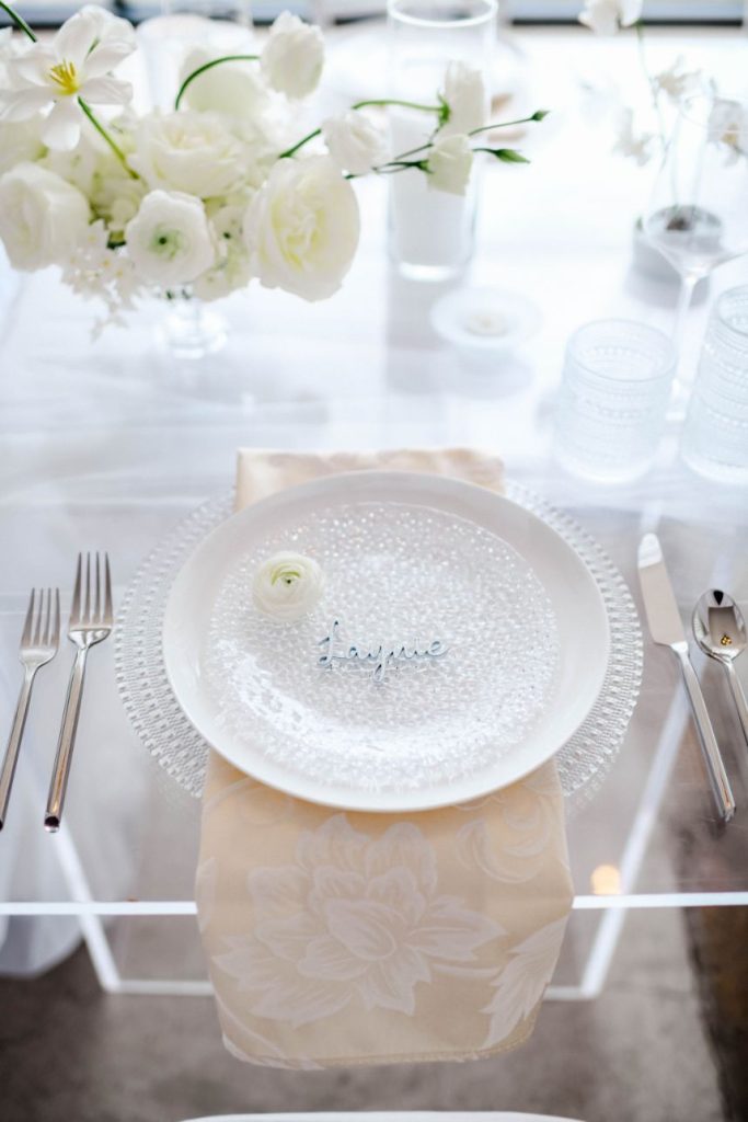 Having a white wedding of your very own is a tale as old as time, but we love seeing new, refreshing ways to rethink the style. This ethereal white wedding inspiration is given a modern touch with clear acrylic decor and rentals from Party Time Rentals that, paired with the styled shoot’s exquisite monochrome floral design, work to elevate and update the billowy white scene. A simplistic tablescape made up of ivory linens and silver flatware carries the same elegant tone seen within this gallery skillfully captured by Rachel Driskell Photography through a bright editorial lens. One of our favorite elements is the abstract acrylic seating chart accented with delicate cream-colored blooms. What a fun way for guests to find their seating! We think this dreamy, ethereal white wedding inspiration is almost too good to be true. Cheers!