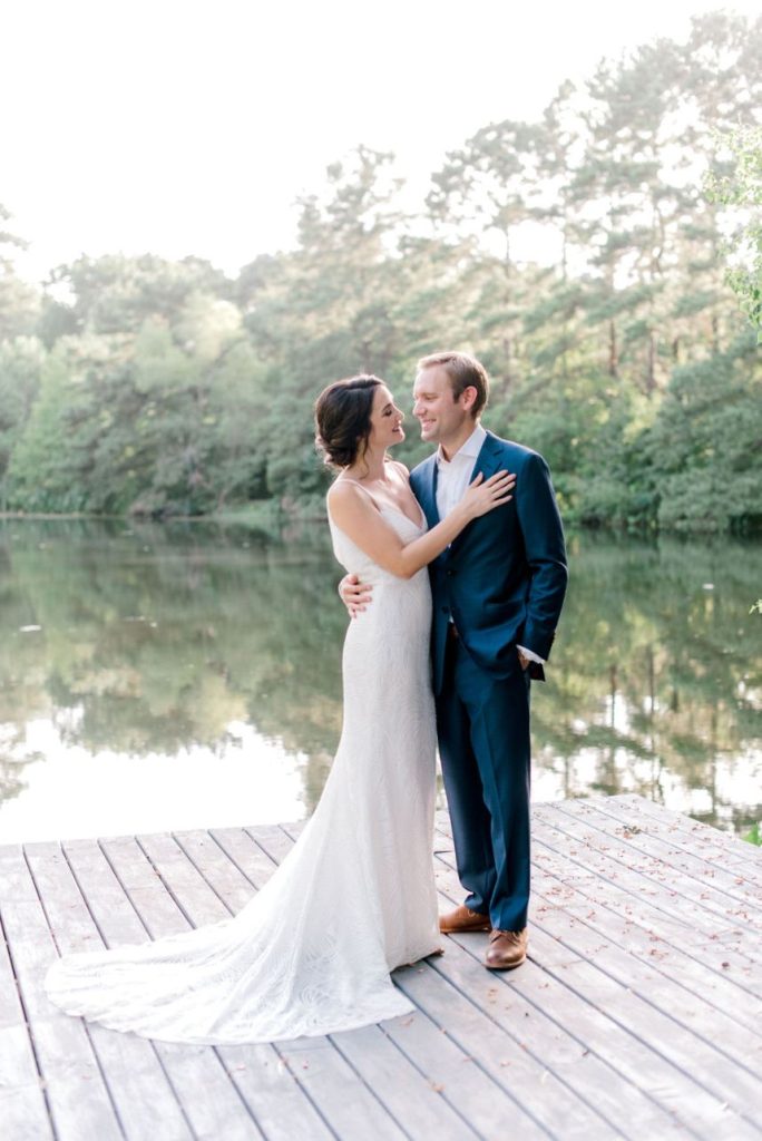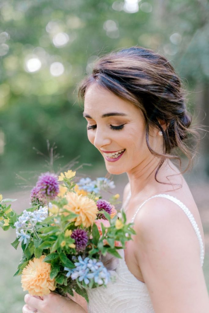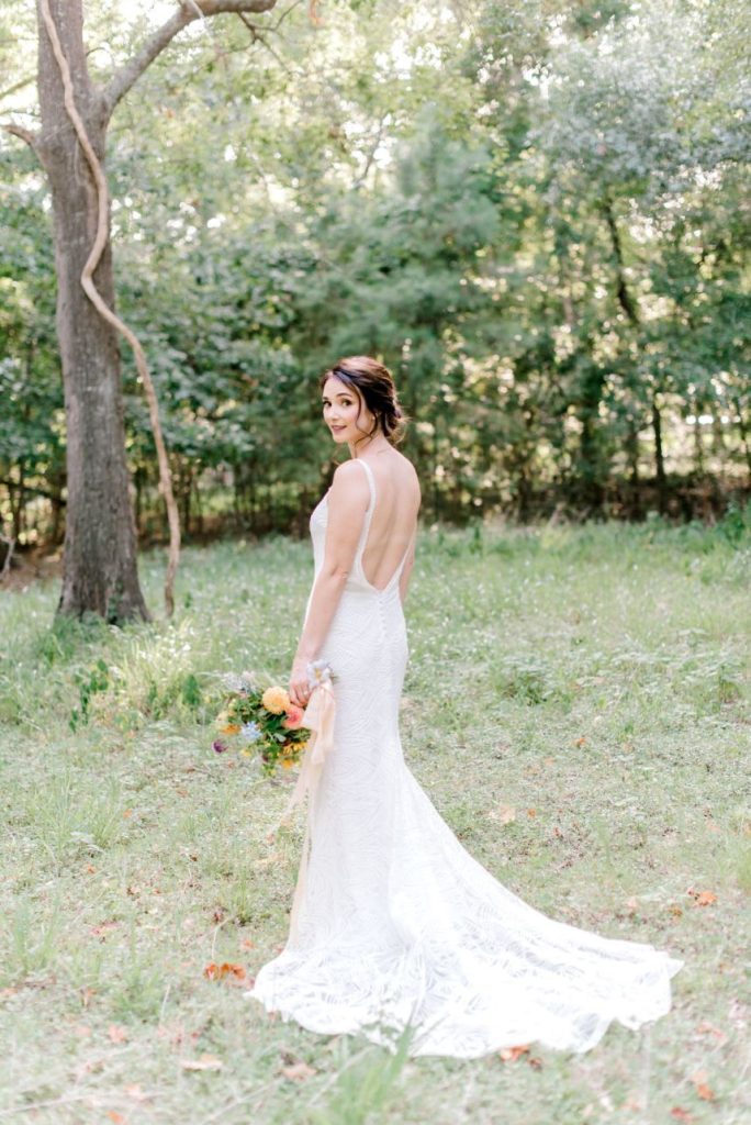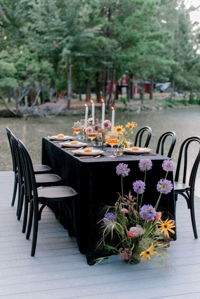 Held at Forever 5 Events, this effortlessly elegant wildflower wedding inspiration features a fun and playful palette, plus so many other darling details! Nestled on 16 captivating acres of property perched on a lake, the unique design of Forever 5 Events allows the water to reflect off the floor-to-ceiling windows and copper fins situated between the pearlesque siding. The vertical installation of the siding matched with real copper fins and a copper-colored metal roof ensure its one-of-a-kind beauty. You will fall in love with this venue so fast! Our faux bride looks absolutely radiant in a beaded deep V-neck gown from Unbridaled featuring an open back that feels just as wild-spirited and wildflower-inspired as it looks. So stunning! Peachy pastel florals pop in the sweetest way possible on a black tablescape and opulent gold flatware only accents this playful palette even more. We definitely gained some color inspo from this free-spirited wildflower wedding inspiration at the least! Read on for a note from the venue owners about the vision behind the design of this sweet styled shoot. Cheers!