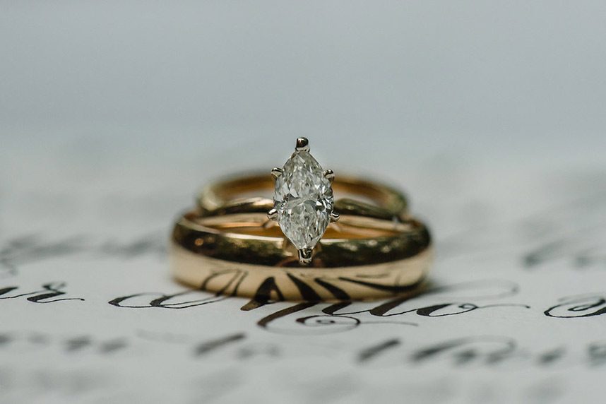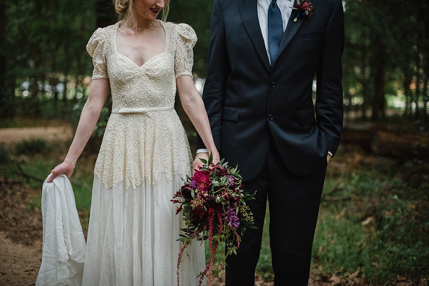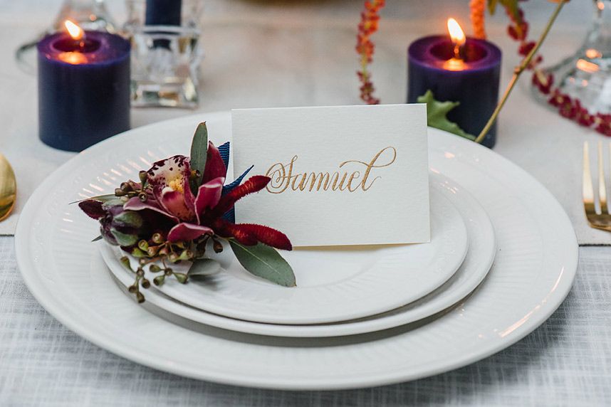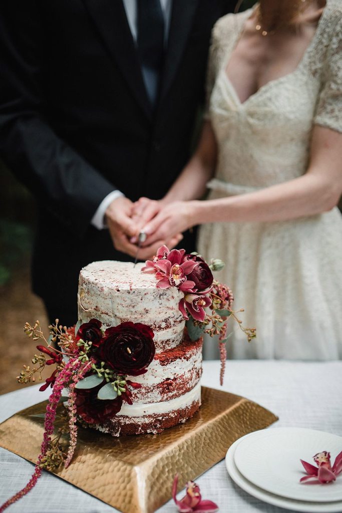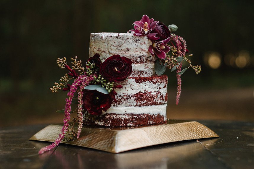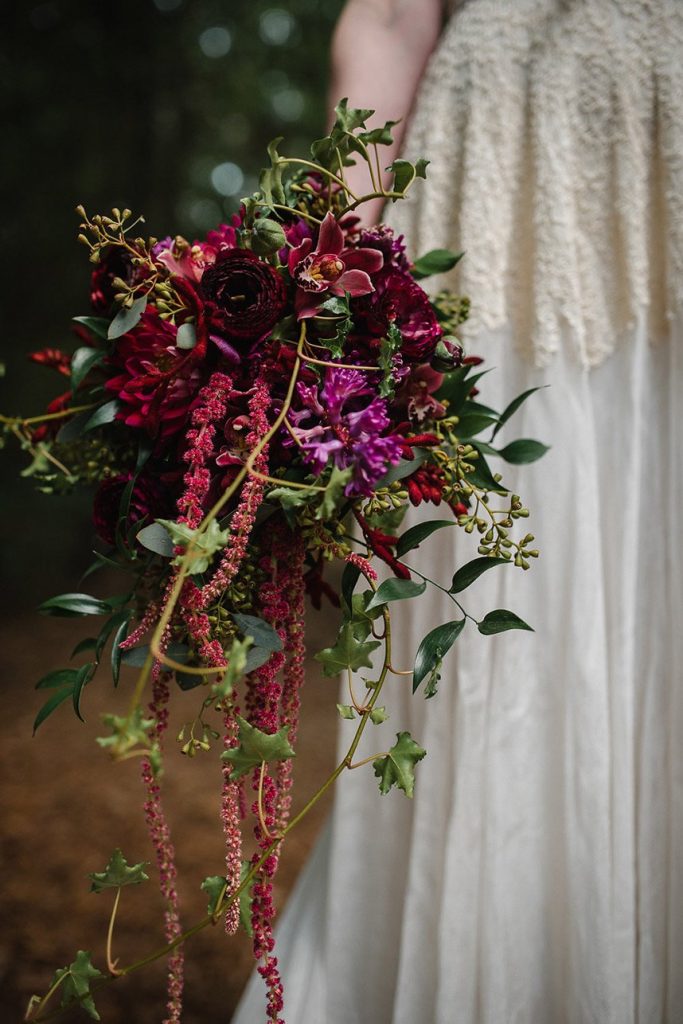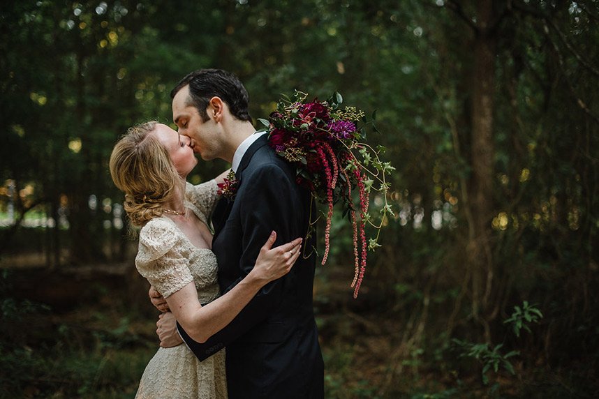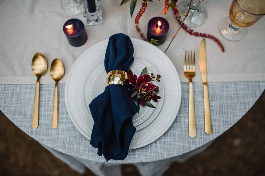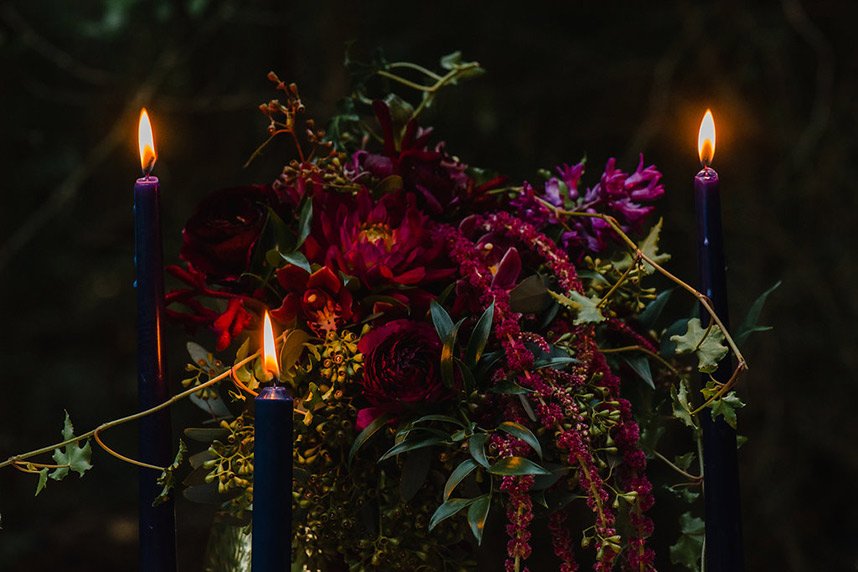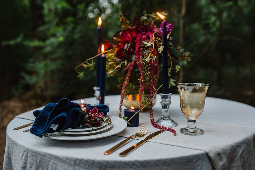 The romantic and moody vibe of this woodsy jewel tone styled shoot by Bonnie Scott is making us fall in love! The rich and vibrant florals in stunning colors of dark red, magenta and deep pink were perfectly done by Petals by Design, and really make a statement against the dark green background. Captured by Melodic View along with second shooter Erin Grace Photography, everything from the delectable red velvet cake made by Sweet Treats Bakery to the navy and gold accents perfectly set the mood for this dreamy shoot. Camel & Birdie worked to create unique and elegant invitations with traditional calligraphy and stunning place settings. The soft candlelight that flows across the table works along with the bride’s beautiful vintage dress to help complete the ambiance and make you feel the romance! Happy Friday!