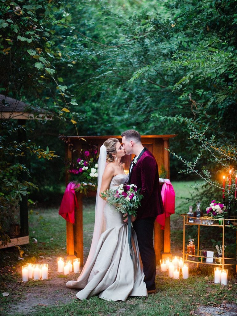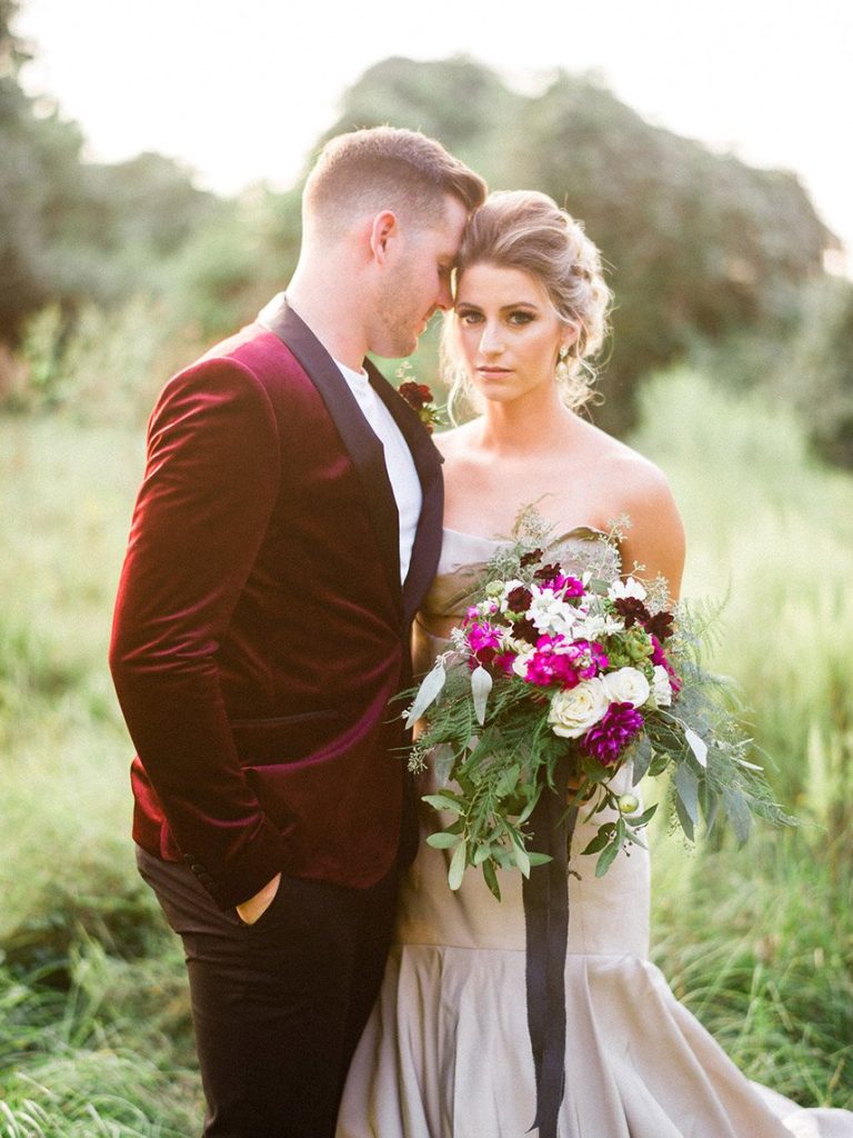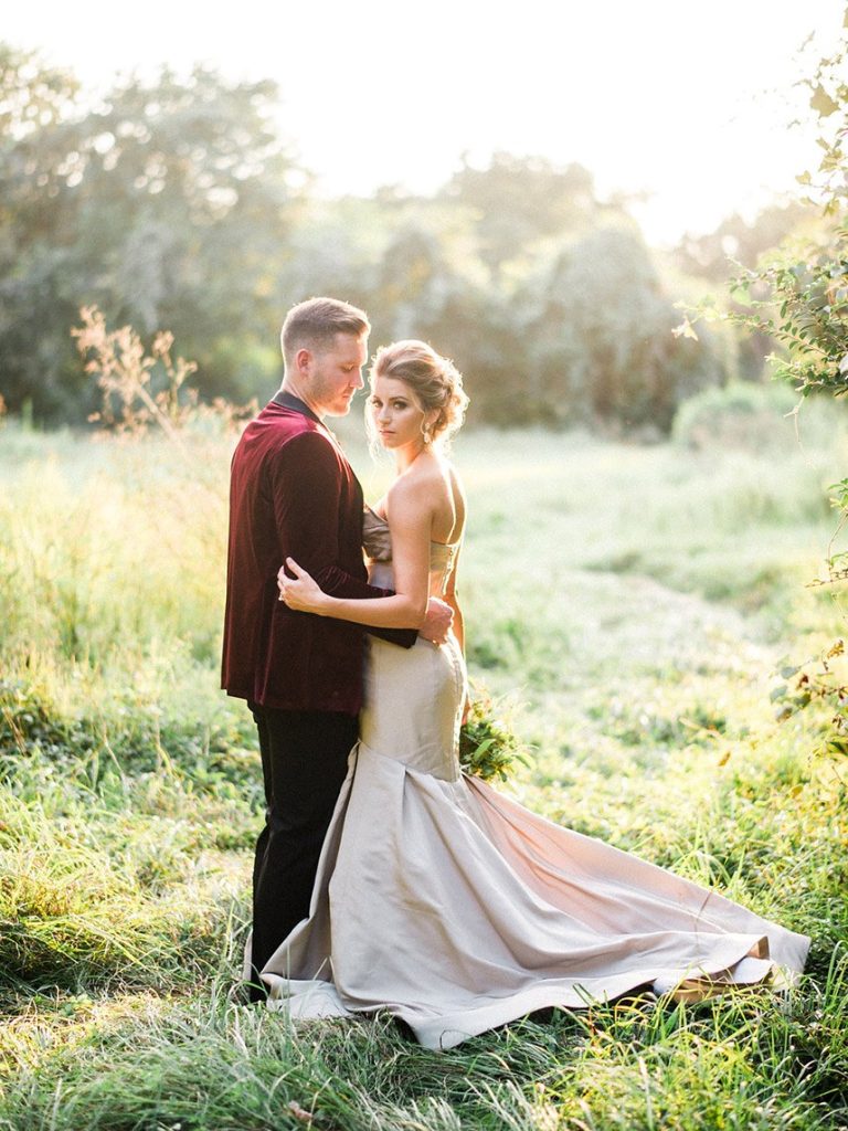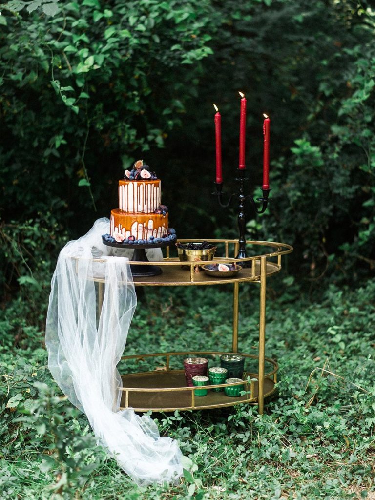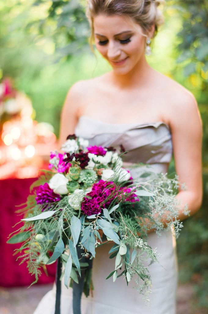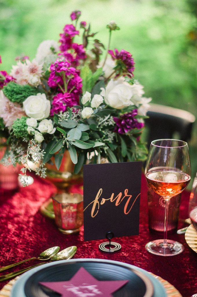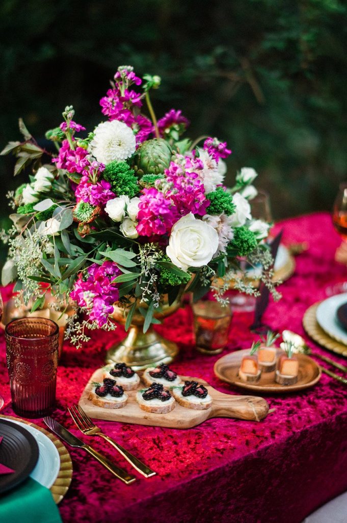 Situated in the overgrown meadow of an opening to the woods, Glitter and Whiskey Events and Makeup by Alli Kirk brought a fairytale vision to life in this styled shoot captured by Awake Photography through the use of romantic jewel tones, luxe decor and earthy natural elements. The team created floral arrangements to mimic the mood with ample greenery, wildflowers and blooms in shades of merlot and fuchsia. A bold paper suite from Paper Tie Affair introduced the thematic feel of the shoot with bright berry and black watercolored backgrounds. Suitable for a setting in the woods, Red Sage Catering whipped up plates of enticing farm-to-table bites incorporating fresh fruits, vegetables and herbs. Of course, we have to mention the bride’s glamorous and modern gown from Unbridaled – a strapless, cutout gown in the most stunning shade of taupe. Incorporating elements of drama and sweet romance, we’re loving every detail of this shoot! Cheers!