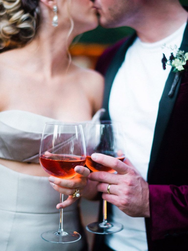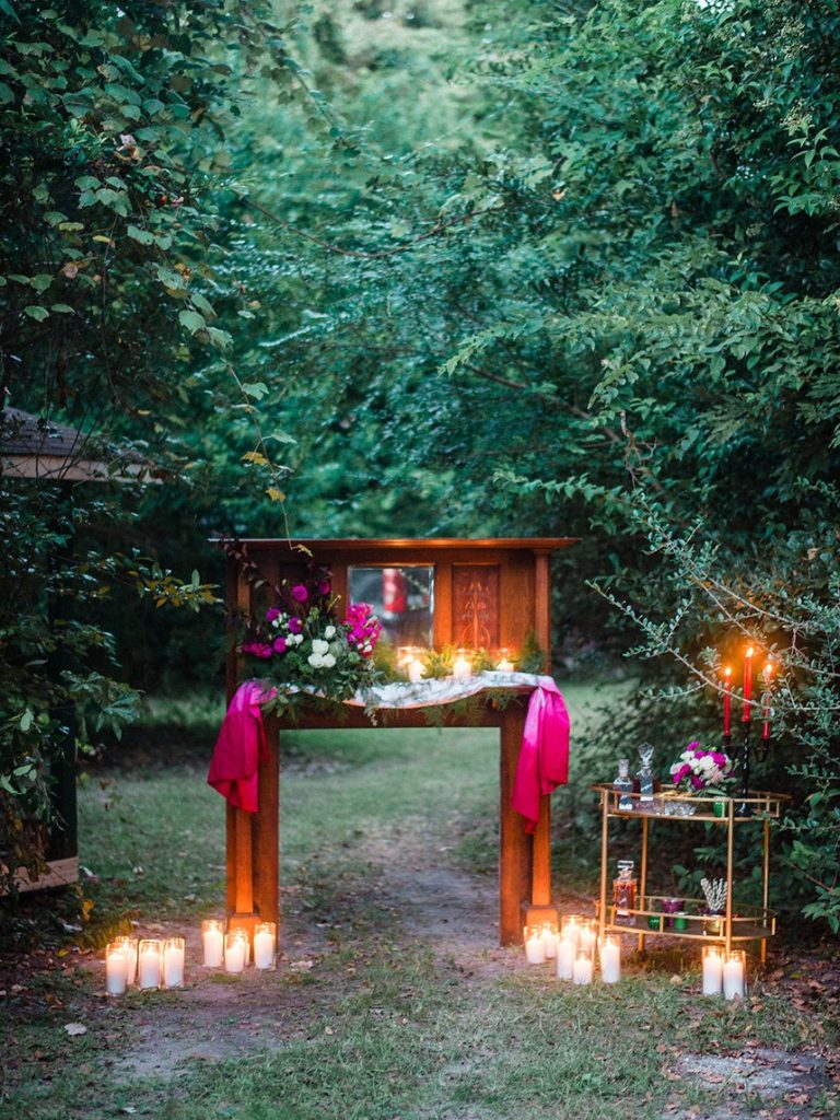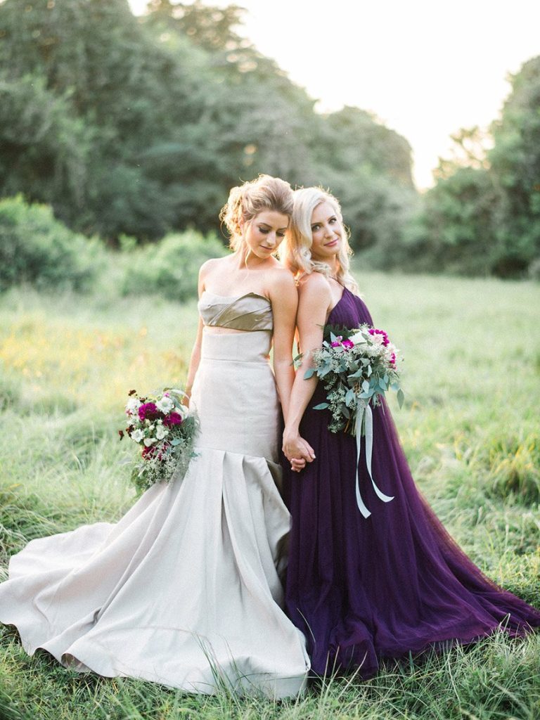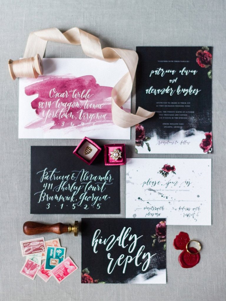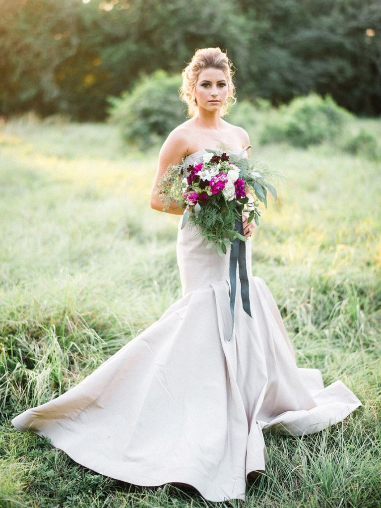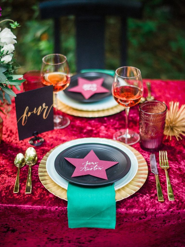 Situated in the overgrown meadow of an opening to the woods, Glitter and Whiskey Events and Makeup by Alli Kirk brought a fairytale vision to life in this styled shoot captured by Awake Photography through the use of romantic jewel tones, luxe decor and earthy natural elements. The team created floral arrangements to mimic the mood with ample greenery, wildflowers and blooms in shades of merlot and fuchsia. A bold paper suite from Paper Tie Affair introduced the thematic feel of the shoot with bright berry and black watercolored backgrounds. Suitable for a setting in the woods, Red Sage Catering whipped up plates of enticing farm-to-table bites incorporating fresh fruits, vegetables and herbs. Of course, we have to mention the bride’s glamorous and modern gown from Unbridaled – a strapless, cutout gown in the most stunning shade of taupe. Incorporating elements of drama and sweet romance, we’re loving every detail of this shoot! Cheers!