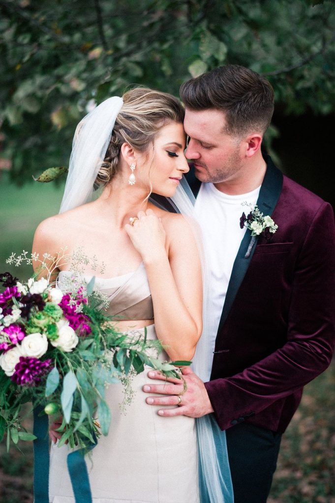 From the event concept designer and makeup artist, Makeup by Alli Kirk: “We loved the romantic outdoor ceremony in the woods at dusk, which led us in the direction we took for our style and design. We chose an organic but luxe feel, with free form bouquets, farm-to-table food creations and rich, autumn burgundy and berry tones throughout, such as the lovely red velvet table linen, semi-naked cake topped with berries and the groom’s velvet coat.“