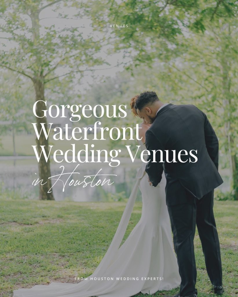 Lakeside ceremony site with white floral arrangements flanking aisle and waterfront view at Houston venue