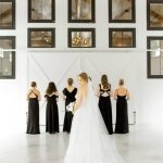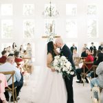 Bride in flowing white gown sits on black velvet settee beneath chandelier in bright white barn with grid windows