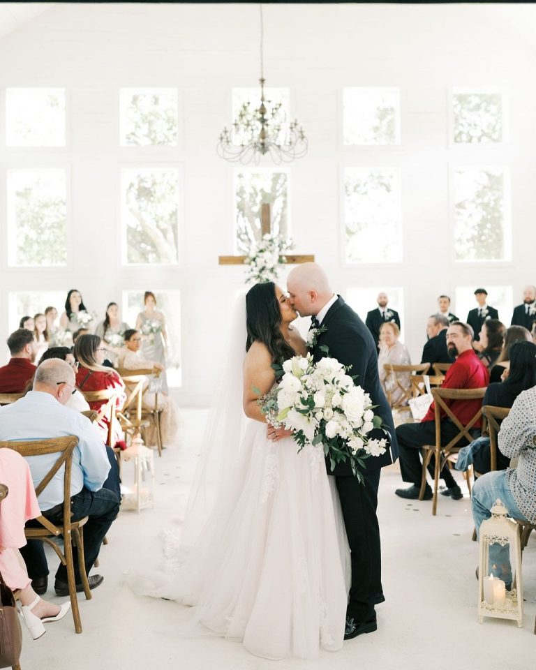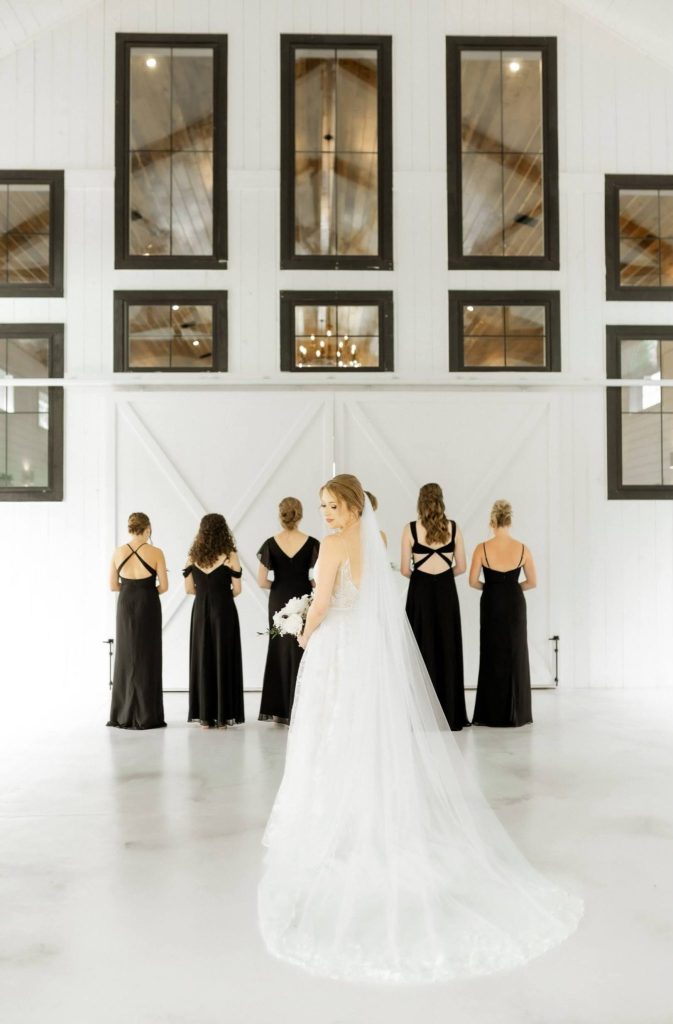 Modern barn venue with white exterior and dark trim surrounded by manicured lawn and trees